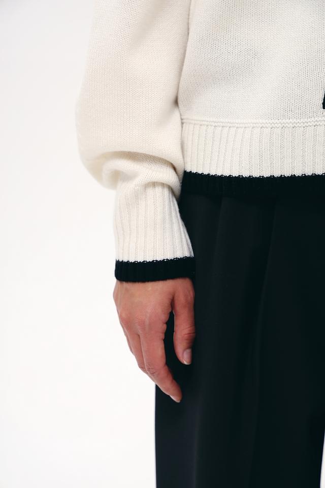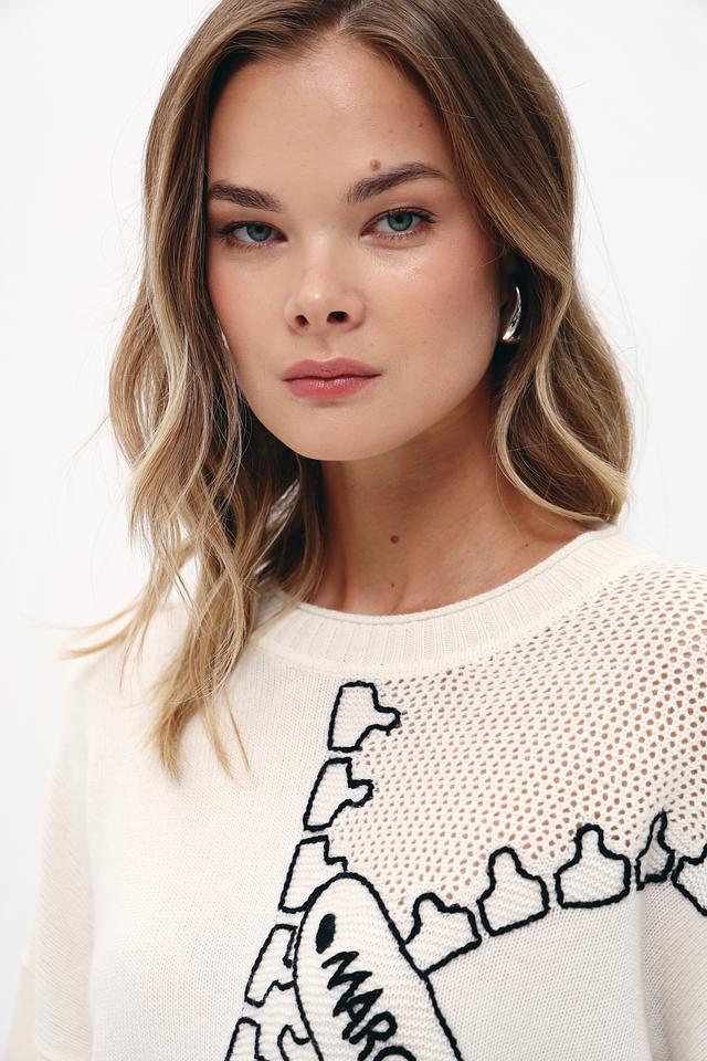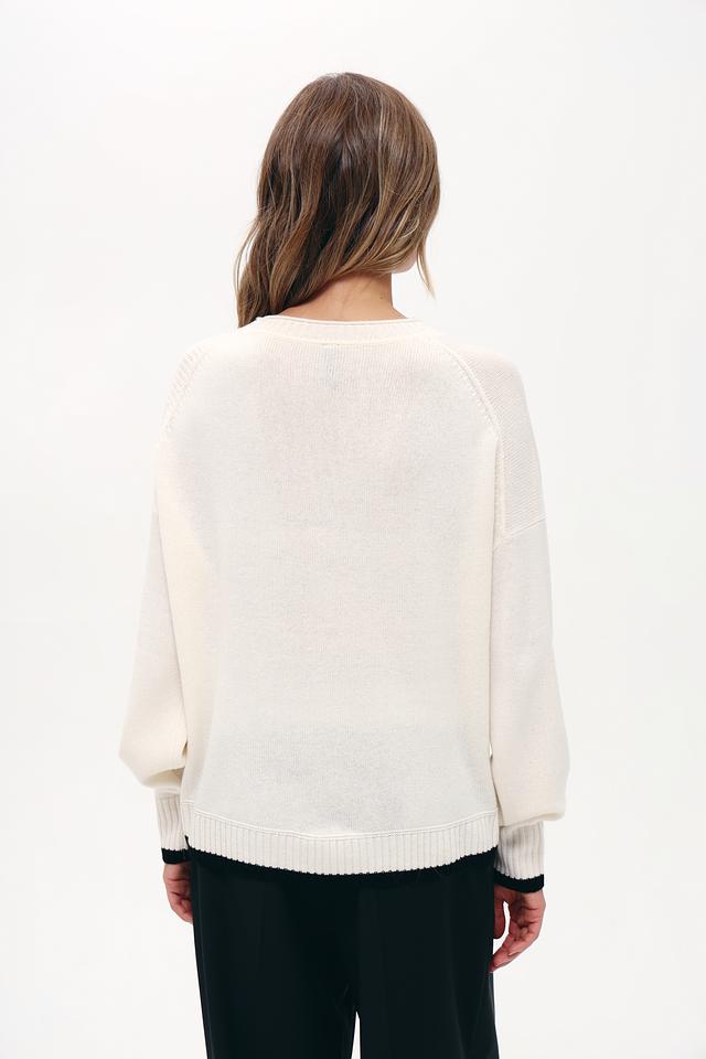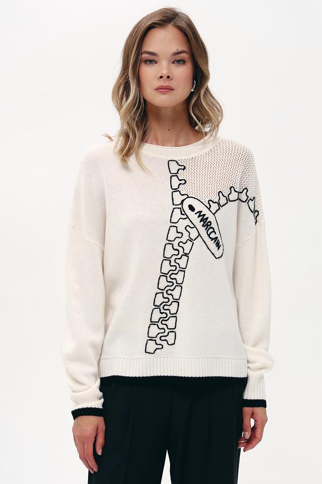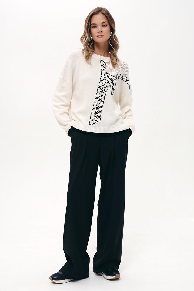 Пуловер имеет приятный бежевый оттенок и украшен графичным принтом, имитирующим цепь, с логотипом бренда. Округлый вырез горловины и манжеты с тонкой черной полоской добавляют изысканности образу.