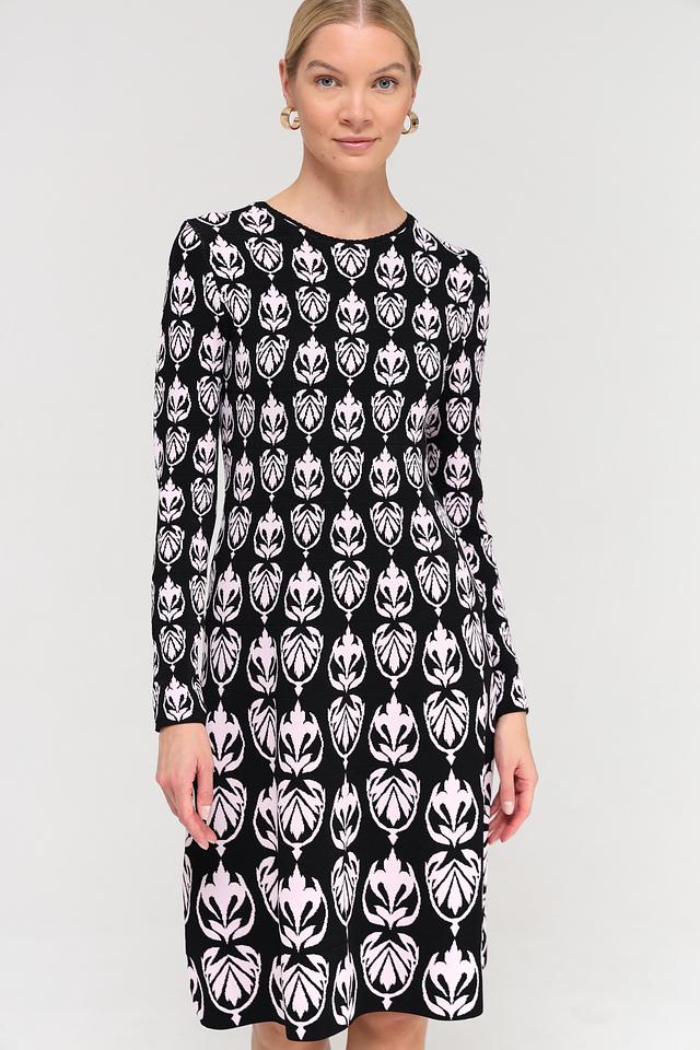 Платье Marc Cain чёрно-белого цвета с оригинальным геометрическим принтом. Модель с длинным рукавом и приталенным силуэтом идеально подойдет для создания элегантного образа. Состав: вискоза 88%, полиэстер 12%