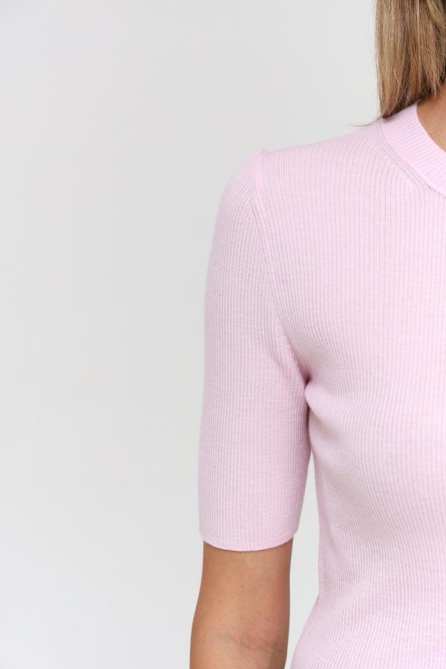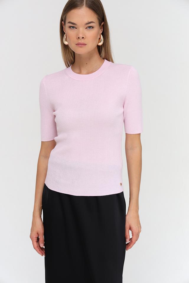 Розовый пуловер Marc Cain с коротким рукавом и круглым вырезом. Изготовлен из тонкой вязки с добавлением металлизированного волокна, что придает изделию деликатный блеск. Идеально дополнит повседневный и офисный гардероб. Состав: шерсть 85%, металлизир. волокно 15%