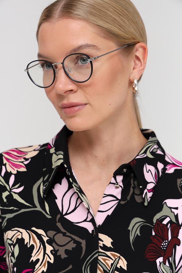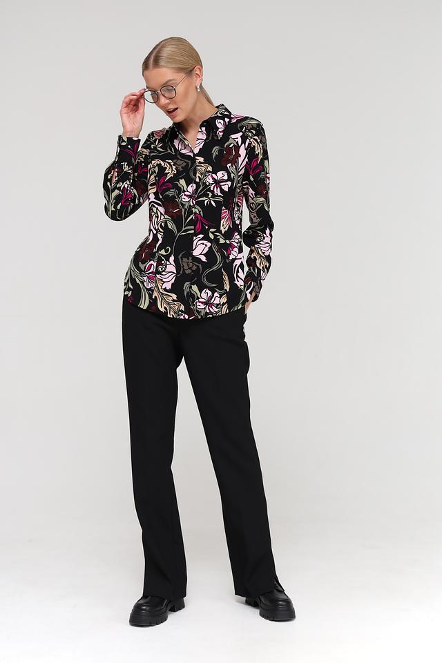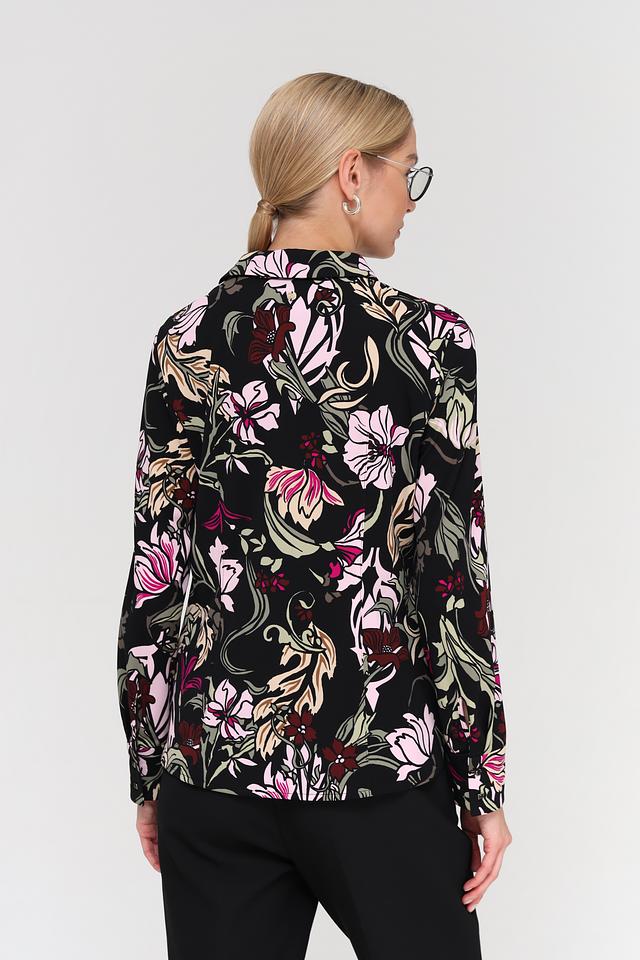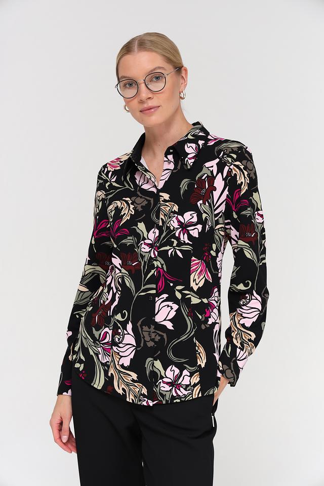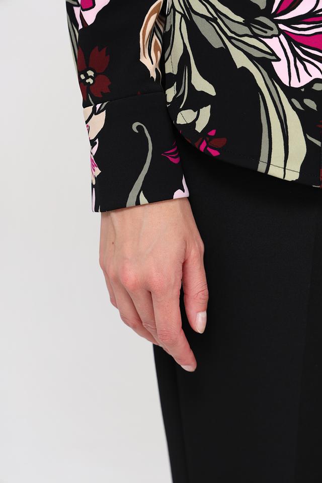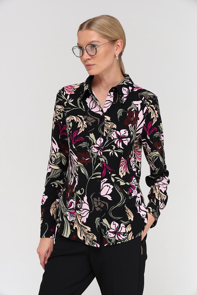 Эта изысканная блуза от Marc Cain выполнена в чёрном цвете и украшена эффектным цветочным принтом, сочетающим в себе оттенки розового, зелёного и бордового. Блуза имеет классический крой с длинными рукавами и отложным воротником, что делает её универсальной для создания различных образов.