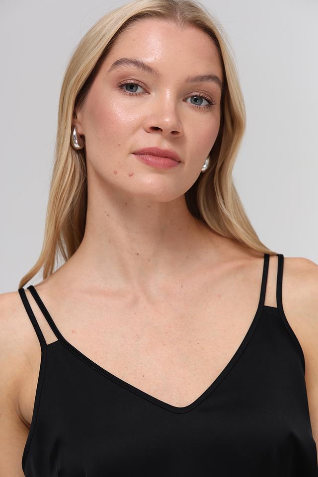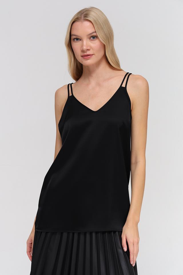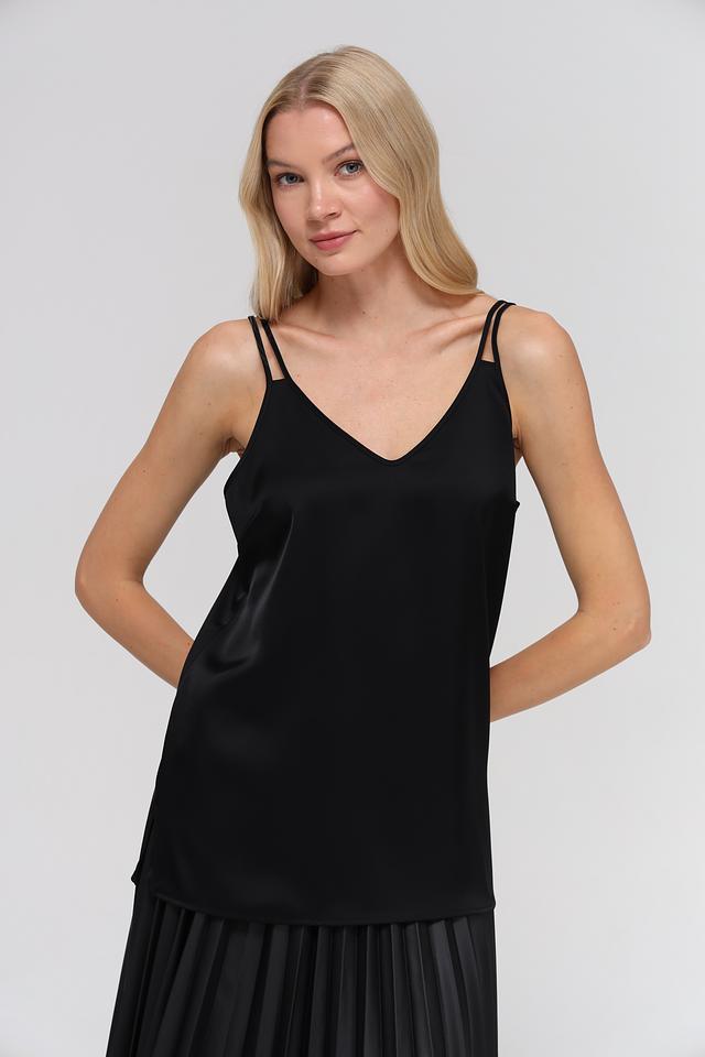 Топ имеет прямой крой, V-образный вырез и тонкие бретели, которые деликатно подчеркивают линию плеч. Благодаря своему лаконичному дизайну, он легко сочетается с различными элементами гардероба – от классических брюк до юбок и джинсов.