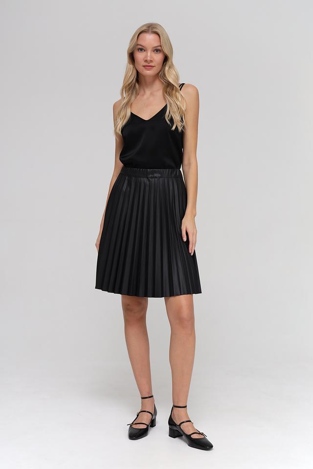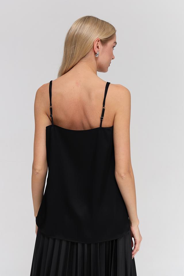 Чёрный цвет делает этот топ универсальным и подходящим для любого случая. Он идеально впишется как в повседневный, так и в вечерний образ. Состав ткани обеспечивает лёгкость и воздухопроницаемость, что особенно актуально в тёплую погоду.