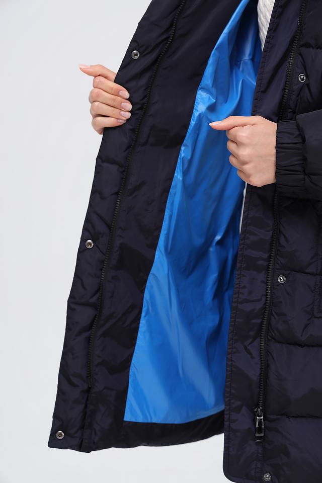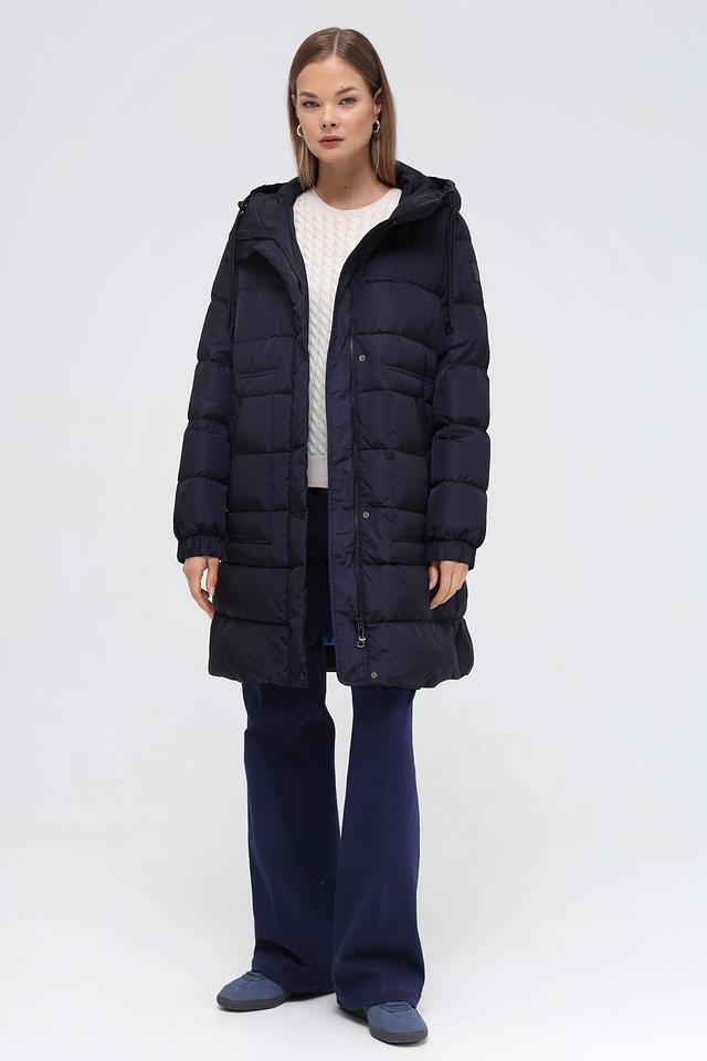 Куртка имеет прямой крой и длину до середины икры, что обеспечивает дополнительное тепло и комфорт. Капюшон со шнурком позволяет регулировать степень защиты от ветра и осадков. Застежка-молния с ветрозащитной планкой надежно защищает от холода.