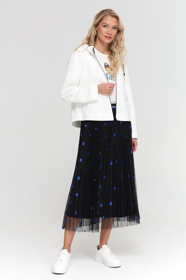 Жакет имеет удобный капюшон с черной сеткой и белой подкладкой, а также стеганую отделку на плечах и спине, что придает ему современный вид. Застежка-молния с черными тесьмой добавляет контраст и подчеркивает динамичный характер модели.