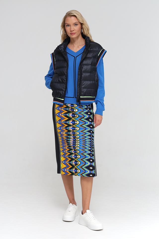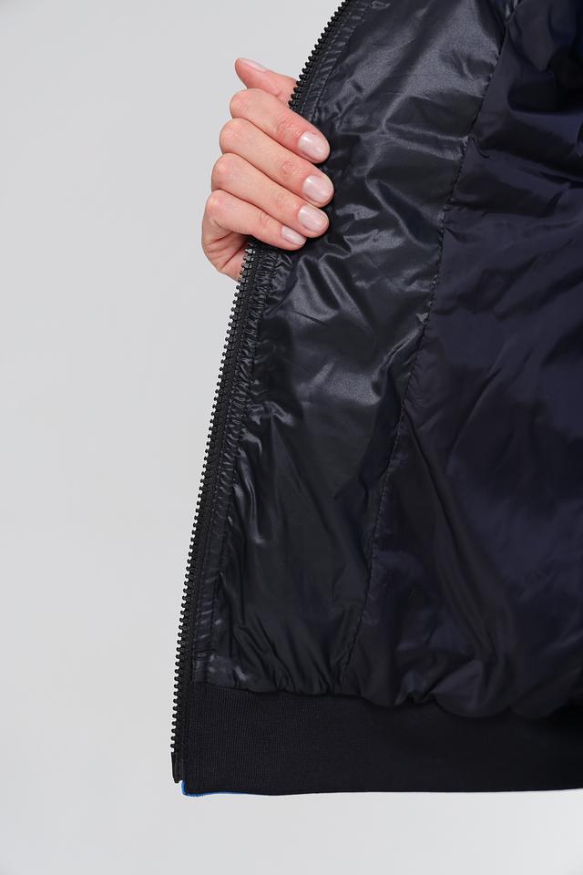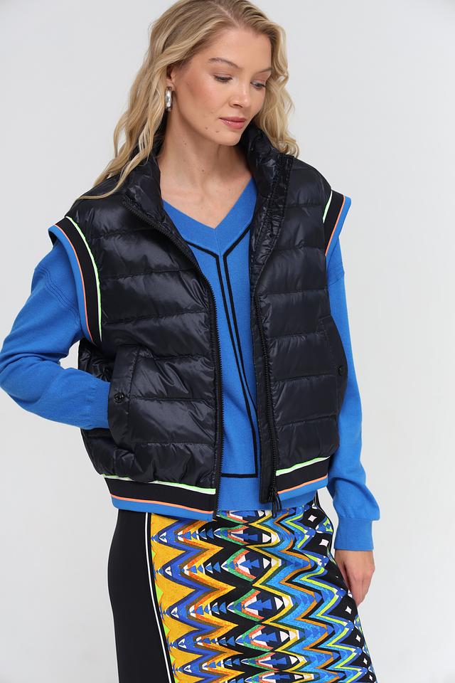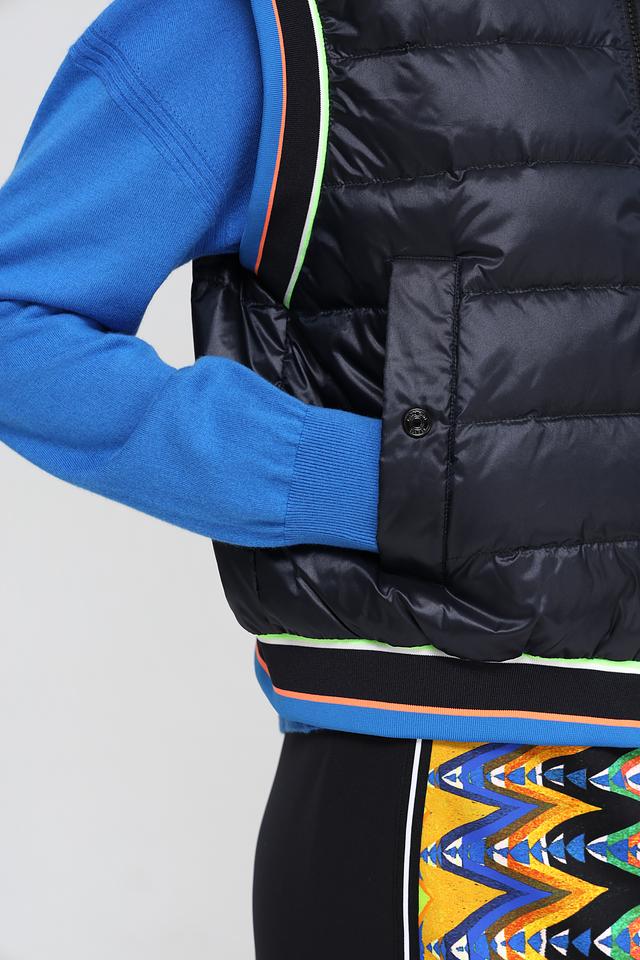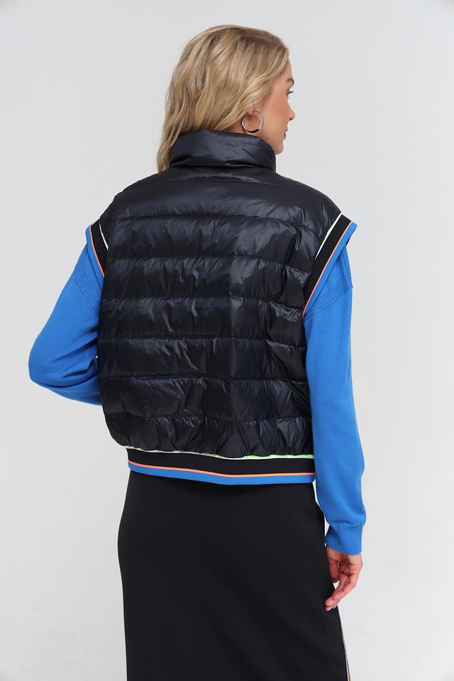 Модель имеет высокий воротник и застегивается на молнию. Отличительной особенностью жилета является яркая контрастная окантовка по краям, выполненная в неоновых оттенках. Жилет имеет удобные боковые карманы.