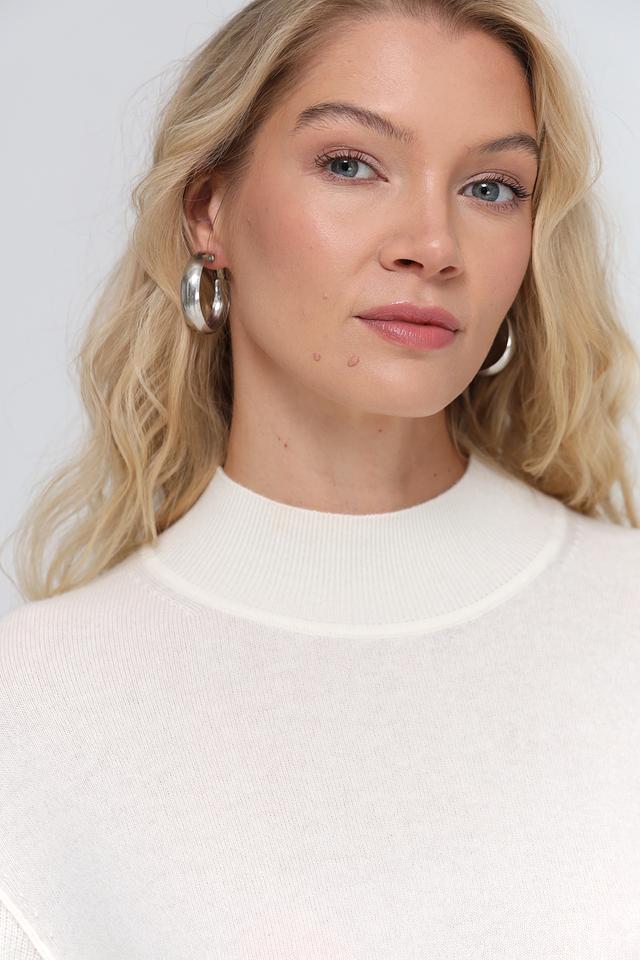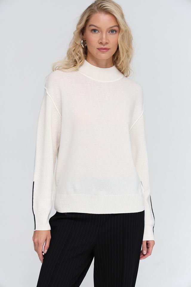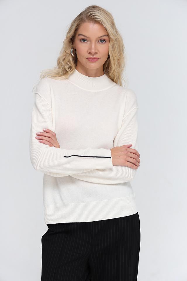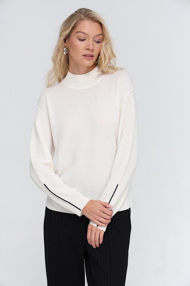Пуловер имеет прямой крой и удобную посадку по фигуре. Декоративные черные полоски на рукавах придают ему современный и динамичный вид. Высокий воротник-стойка добавляет изысканности образу.