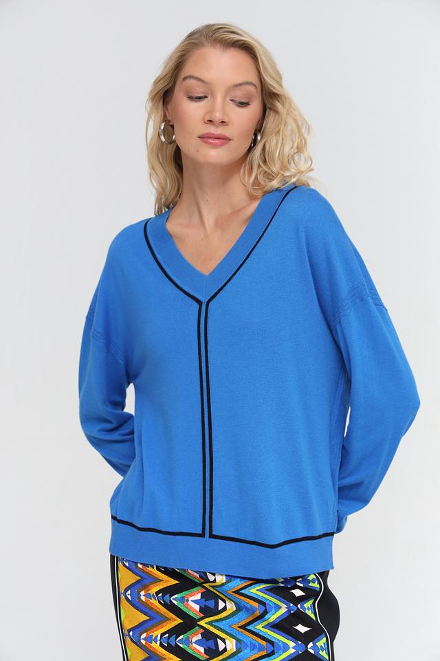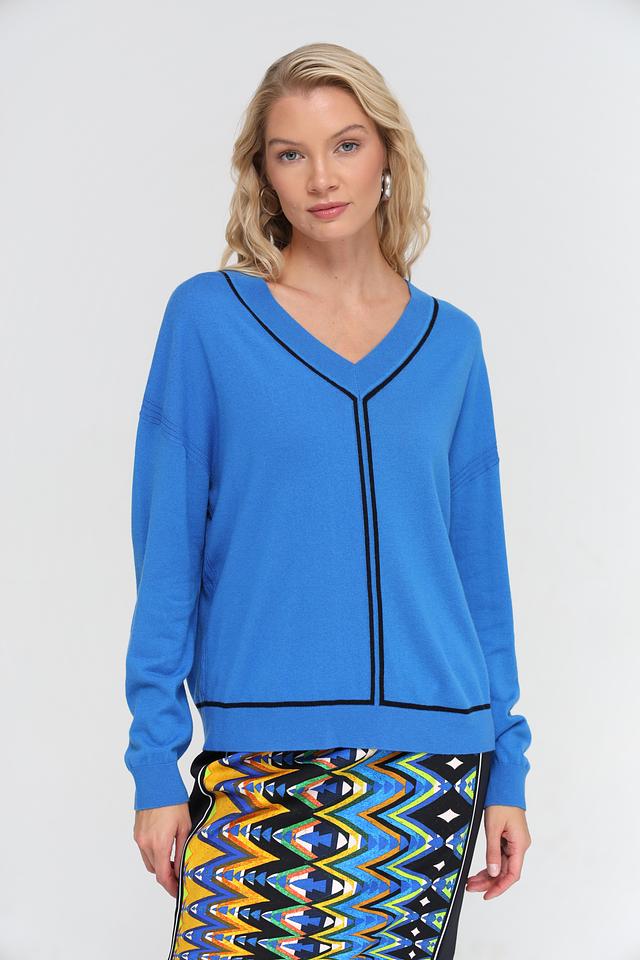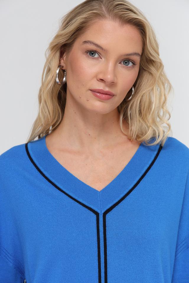 Пуловер имеет V-образный вырез, который подчеркивает линию шеи, и аккуратную чёрную отделку по вырезу и низу изделия. Свободный крой обеспечивает комфортную посадку по фигуре, а длинные рукава делают его идеальным для прохладной погоды.