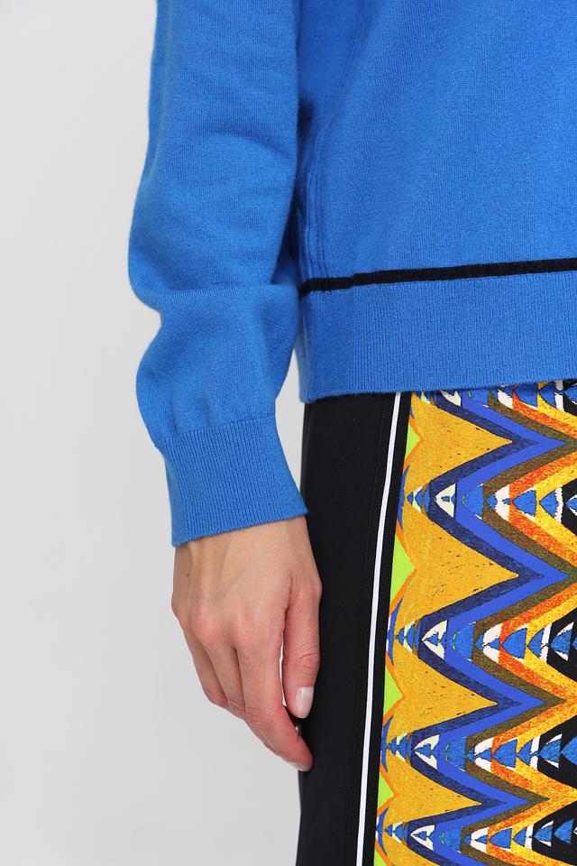 Синий пуловер Marc Cain с V-образным вырезом и чёрной отделкой. Модель выполнена из мягкой смеси шерсти, вискозы и кашемира, обеспечивающей комфорт и тепло. Идеально сочетается с юбками и брюками. Состав: шерсть 47%, вискоза 38%, полиамид 10%, кашемир 5%