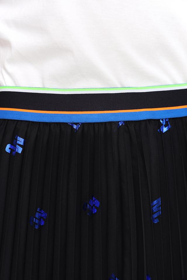 Юбка имеет классический черный цвет, который гармонично сочетается с яркими синими принтами, добавляющими образу оригинальности. Плиссированный крой создает эффект легкости и динамики, а эластичный пояс обеспечивает удобную посадку по фигуре.