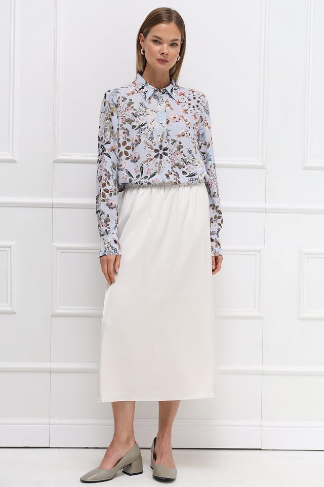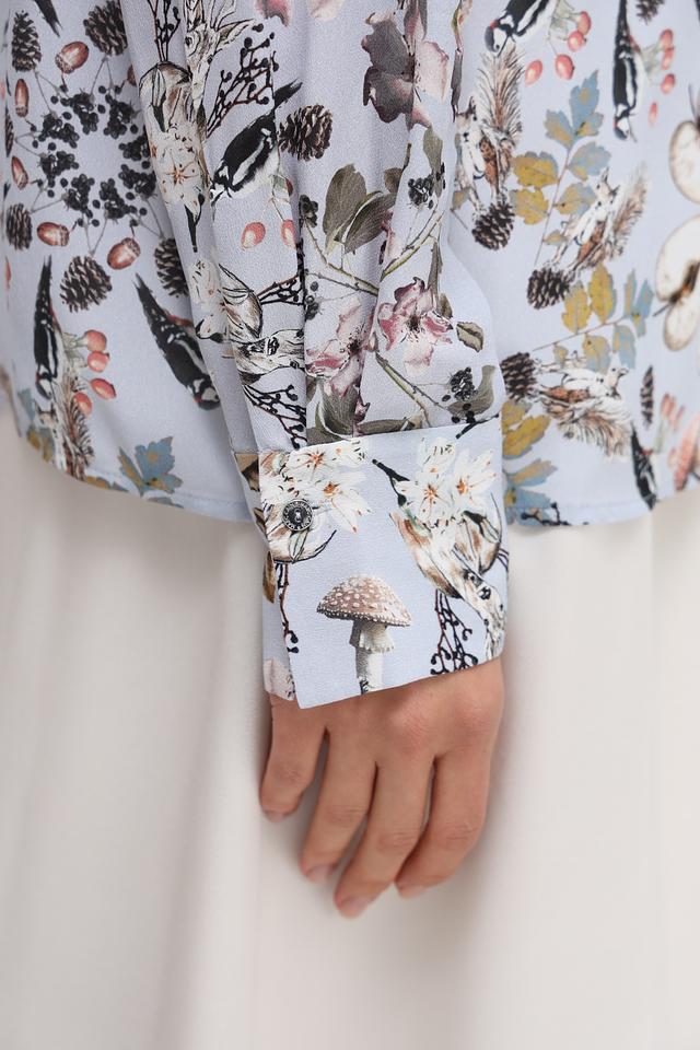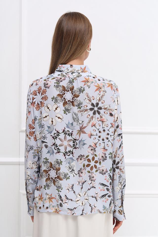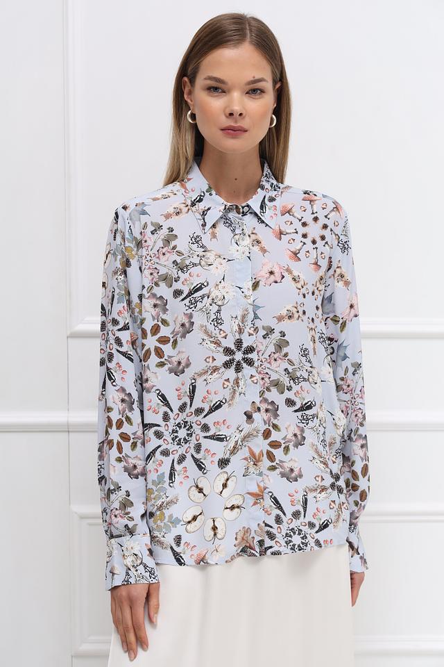 Особенностью данной модели является её нежный голубой цвет и утончённый цветочный принт, который добавляет романтичности и женственности. Классический крой с длинными рукавами и отложным воротником делает эту блузу универсальной и подходящей для любого случая.
