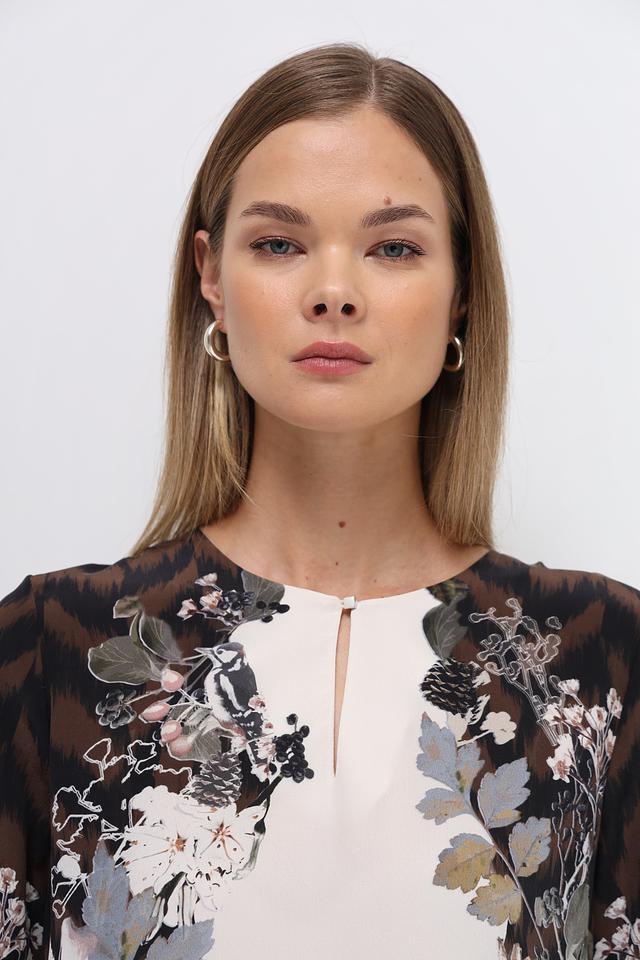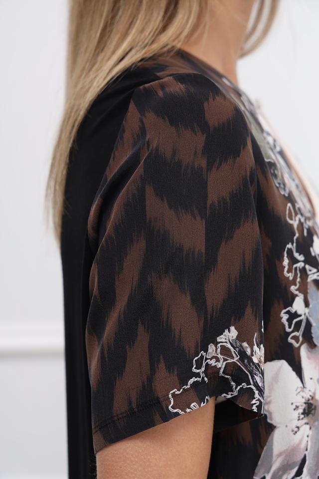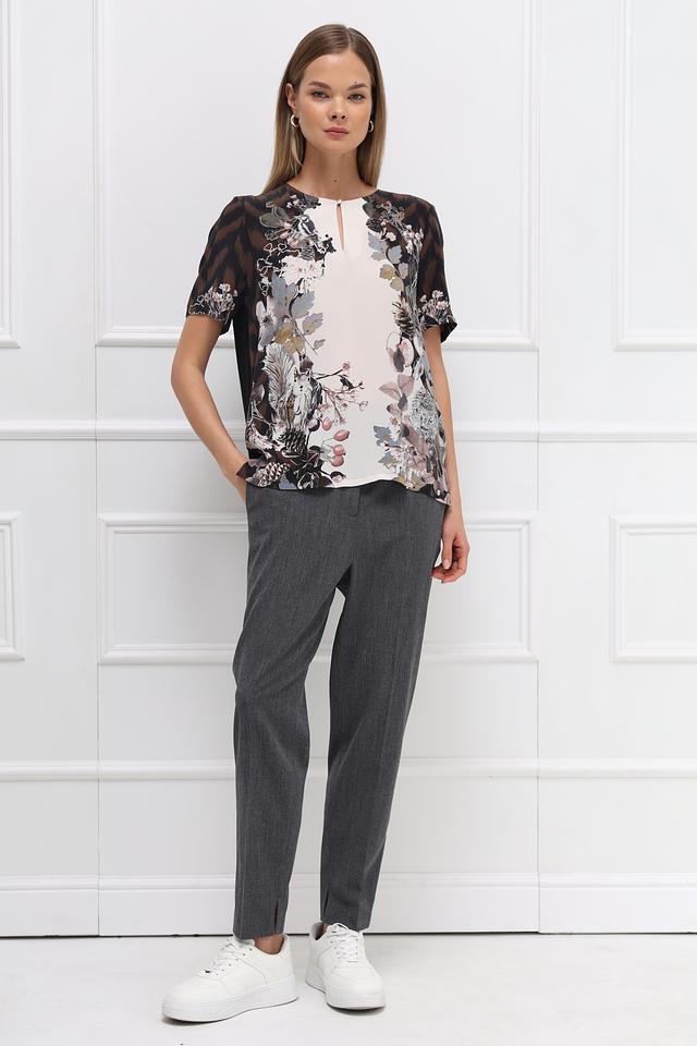 Блуза имеет свободный крой, который не сковывает движений и позволяет создать расслабленный образ. Особенностью модели является яркий цветочный принт, который придает ей неповторимый шарм и женственность. Вырез горловины оформлен небольшим V-образным разрезом.