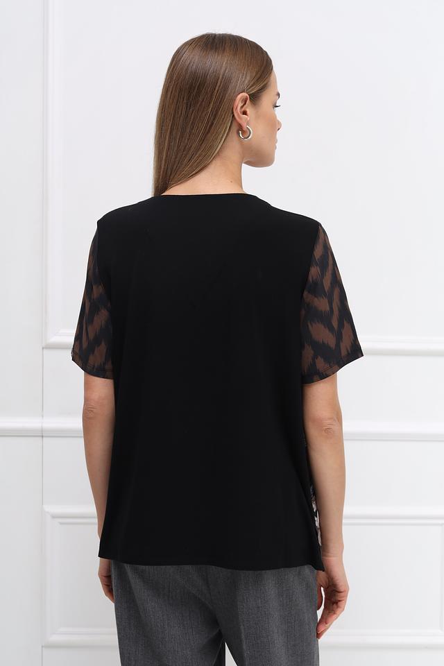 Короткие рукава блузы выполнены из полупрозрачной ткани с цветочным рисунком, что добавляет образу легкости и воздушности. Эта блуза идеально подойдет для создания как повседневных, так и вечерних образов. Сочетайте ее с брюками, юбками или джинсами, чтобы создать стильный и элегантный лук.