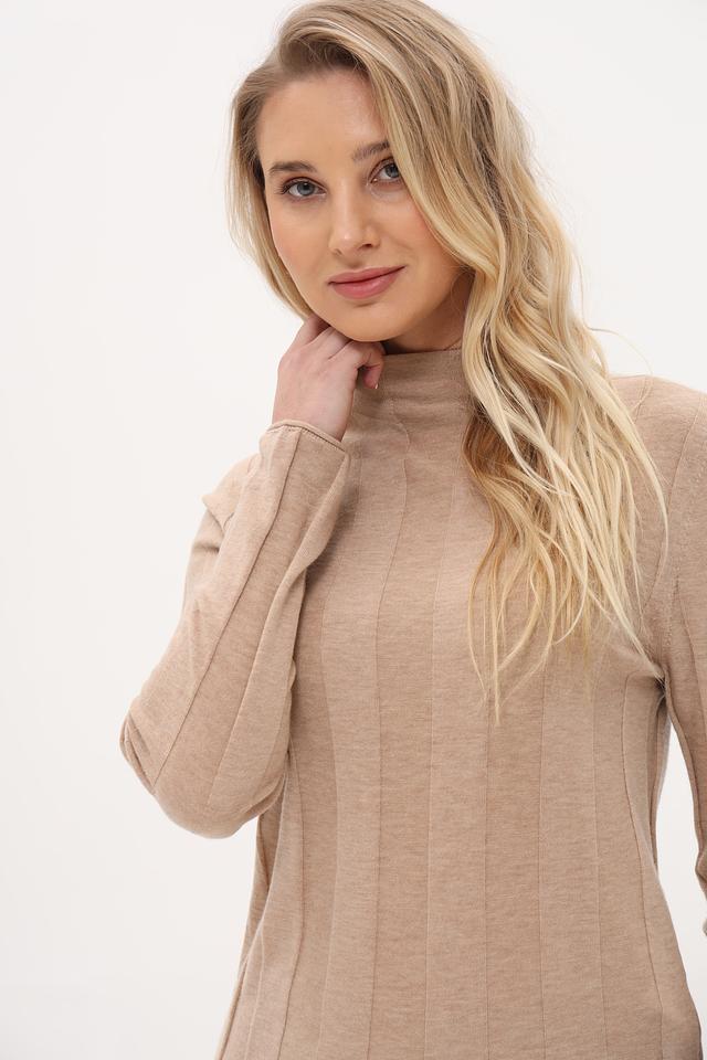Пуловер имеет прямой крой и воротник-стойку, что делает его универсальным для создания различных образов. Вертикальная текстура вязки визуально вытягивает силуэт и добавляет изысканности. Модель идеально подходит для повседневной носки и особых случаев.