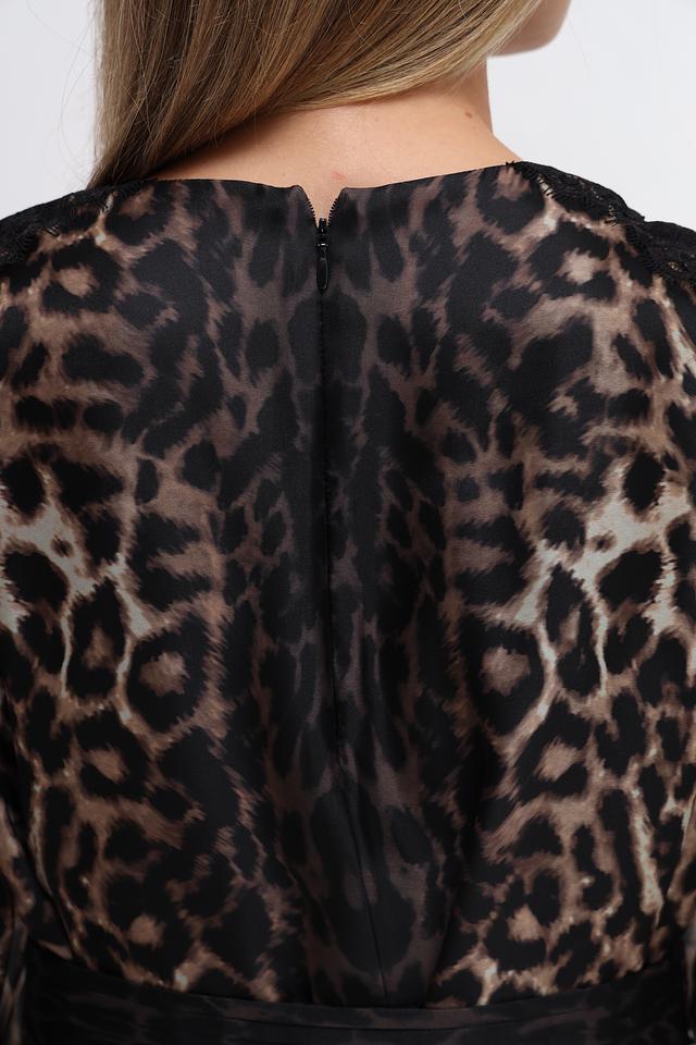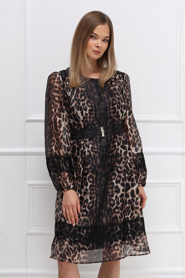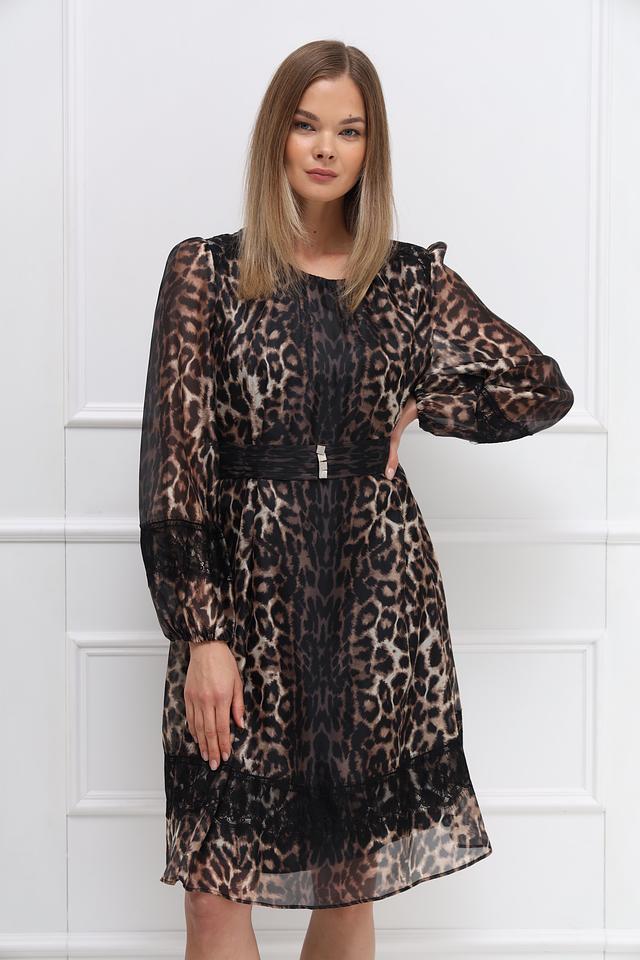 Платье Marc Cain в леопардовый принт – элегантная модель длиной до колена с длинными рукавами и декоративным поясом. Изготовлено из полупрозрачной ткани с кружевными вставками, что придает образу легкость и женственность. Состав: полиэстер 100%
