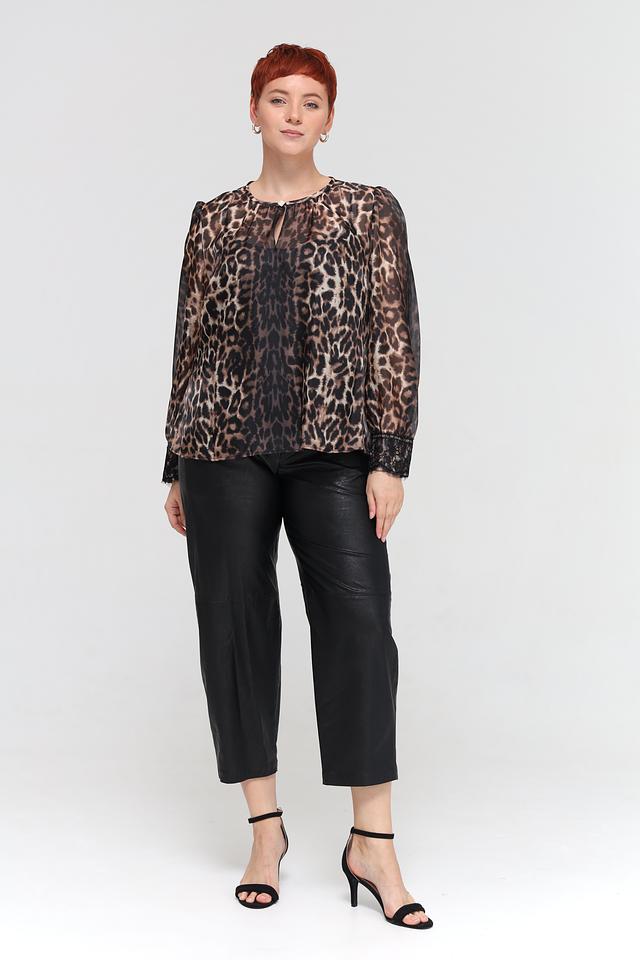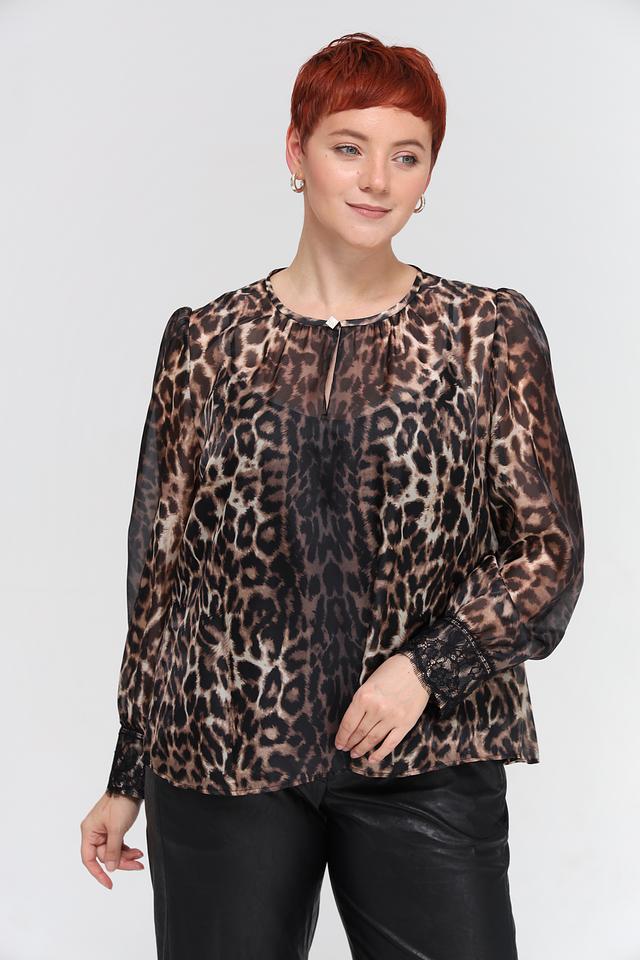 Блуза имеет свободный крой, длинные рукава и круглый вырез горловины, который дополнен небольшим разрезом и завязкой. Полупрозрачная ткань с леопардовым принтом придает модели изысканность и женственность.