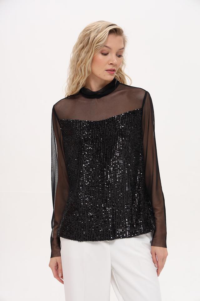 Рукава и часть верхней части блузы выполнены из полупрозрачной сетки, что придает модели легкость и воздушность. Высокий воротник-стойка добавляет изысканности образу.