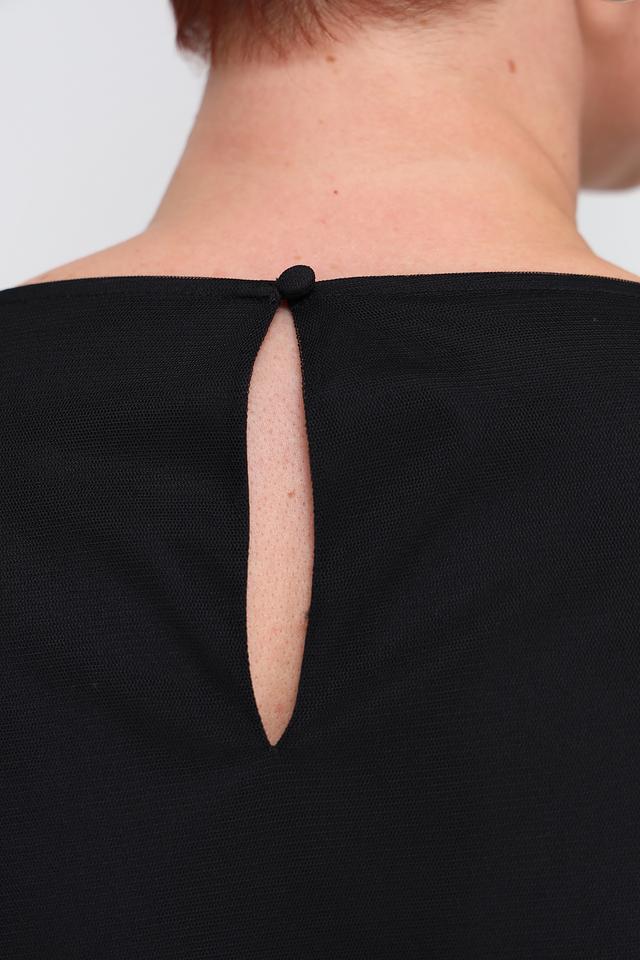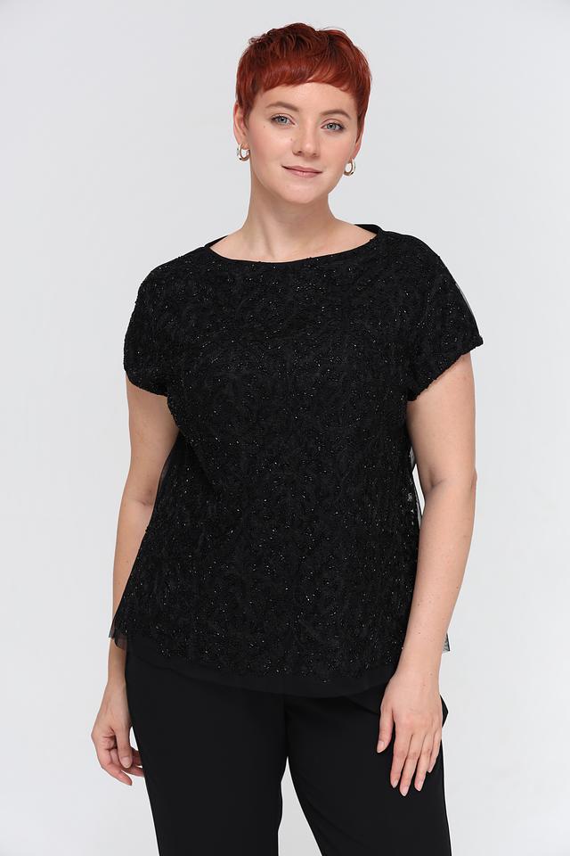 Блуза имеет классический чёрный цвет и украшена изысканной вышивкой, придающей ей особый шарм. Округлый вырез горловины и короткие рукава делают её универсальной для различных случаев.