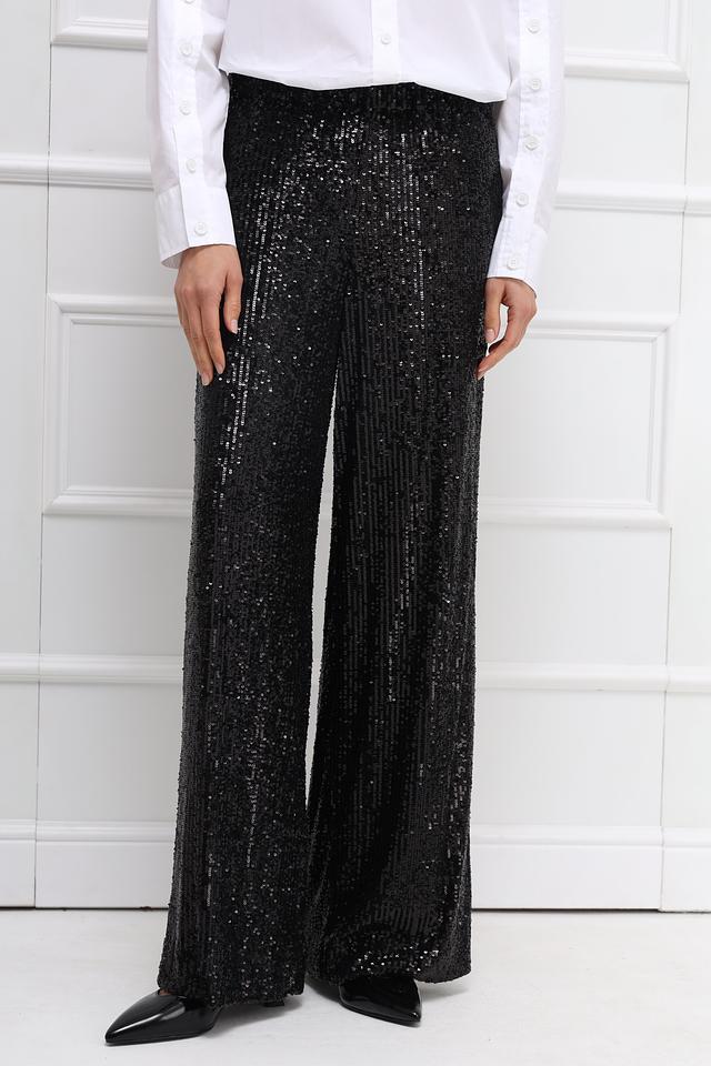 Брюки полностью покрыты мерцающими пайетками, создающими роскошный и праздничный вид. Прямой крой и эластичный пояс обеспечивают свободу движений и удобство в носке. Данная модель идеально подойдет для особых случаев и вечерних выходов.