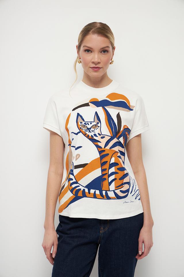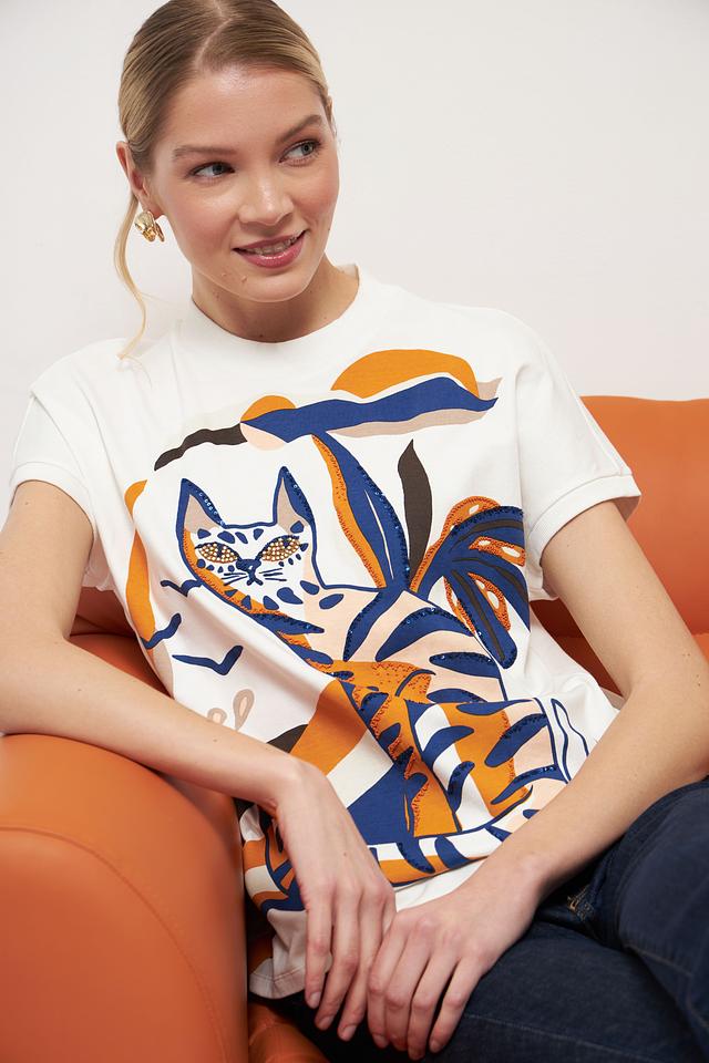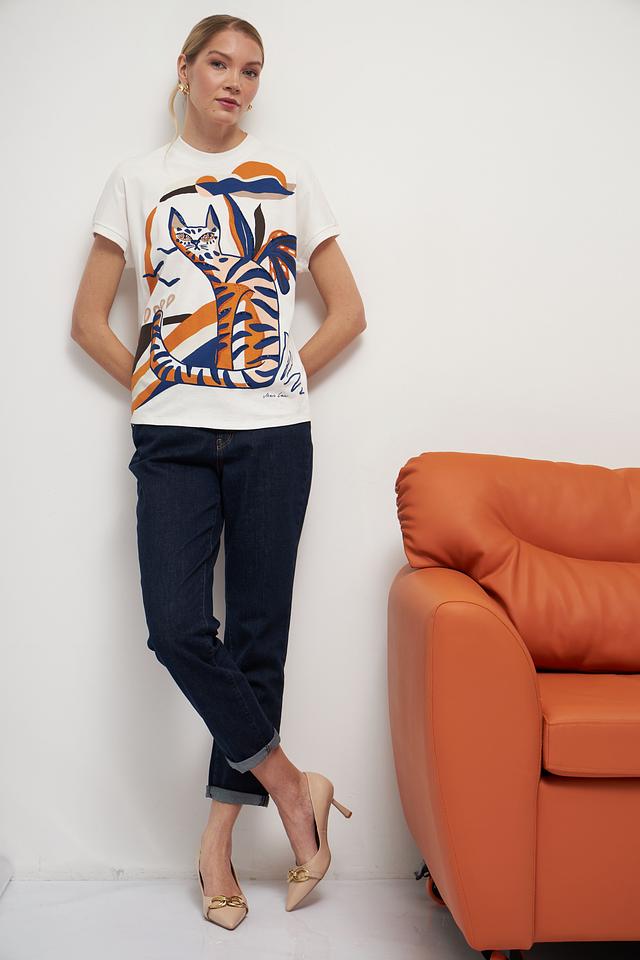 Особенностью данной модели является оригинальный принт с изображением кота, окруженного тропическими листьями, выполненный в насыщенных оранжевых и синих тонах. Этот принт добавляет футболке игривости и индивидуальности.