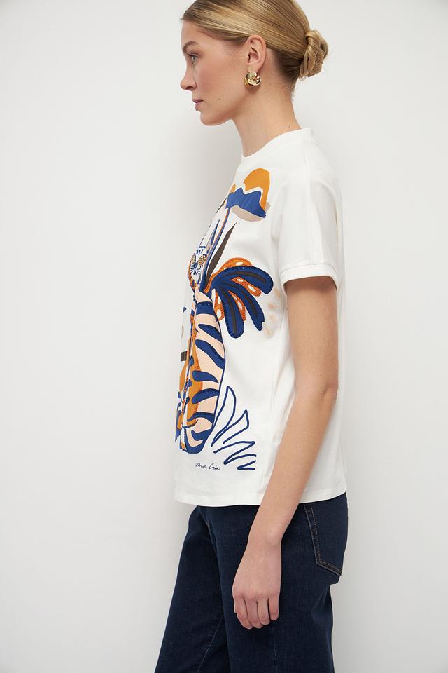 Белая футболка Marc Cain с ярким принтом кота и тропических листьев. Изготовлена из 100% хлопка, обеспечивающего комфорт и воздухопроницаемость. Стильный и оригинальный дизайн для создания неповторимого образа. Состав: хлопок 100%