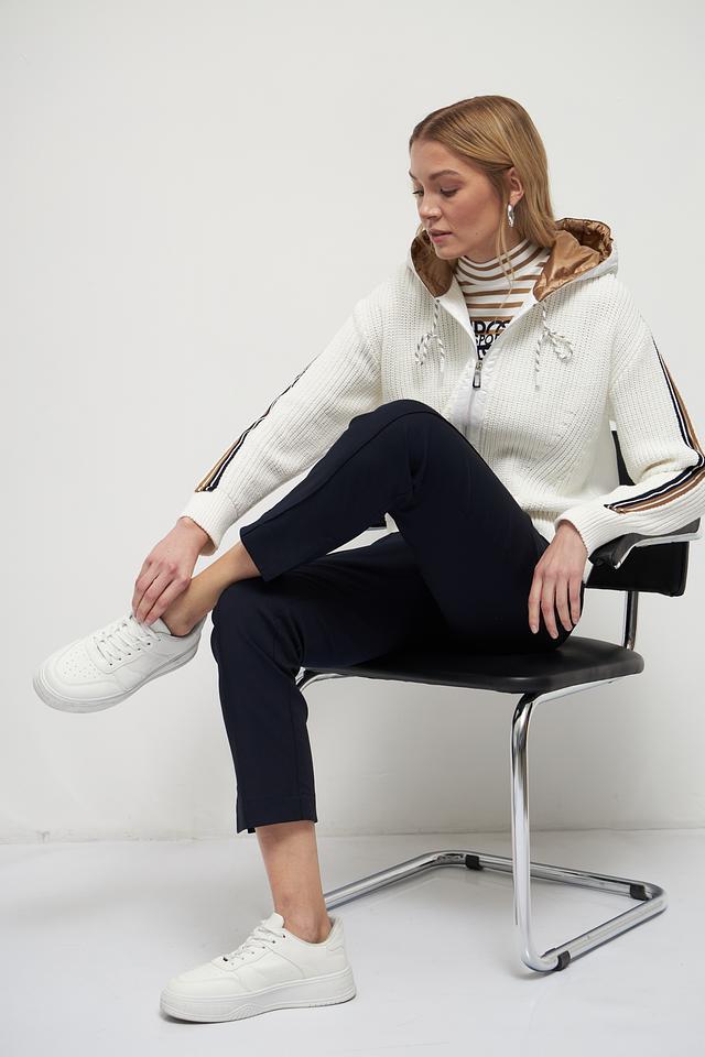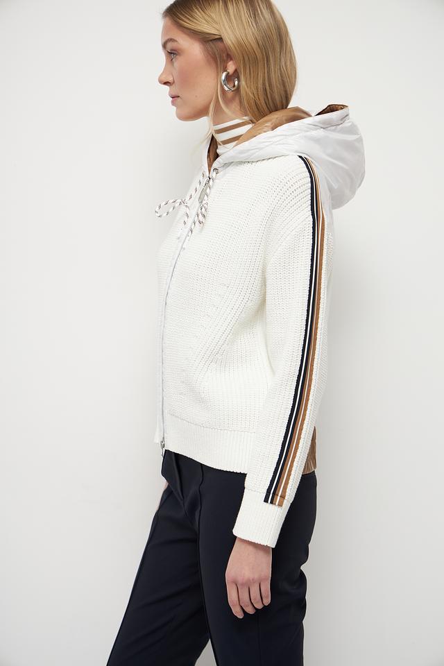 Белый жакет Marc Cain из хлопка с полиэстером, выполненный с декоративными полосками и капюшоном. Застежка – молния. Состав: 90% хлопок, 10% полиэстер. Состав: хлопок 90%, полиэстер 10%