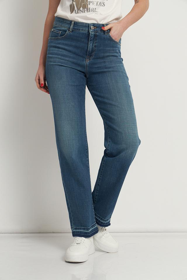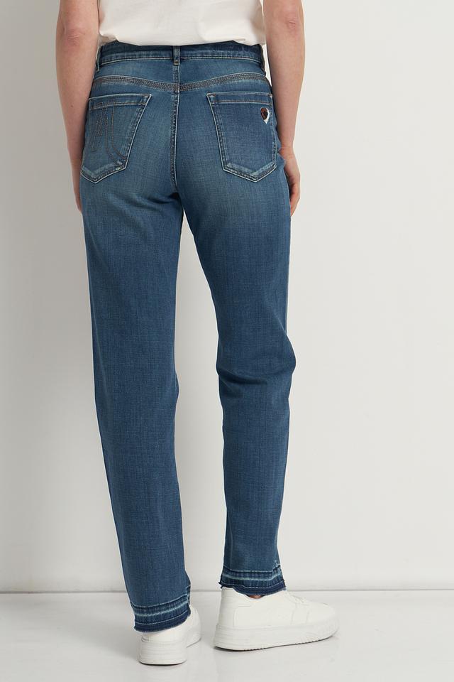 Женские джинсы Marc Cain голубого цвета в стиле casual с прямым кроем и эффектом потертостей. Модель выполнена из качественного хлопка с добавлением эластана для комфортной посадки. Состав: хлопок 92%, эластомультиэстер 6%, эластан 2%