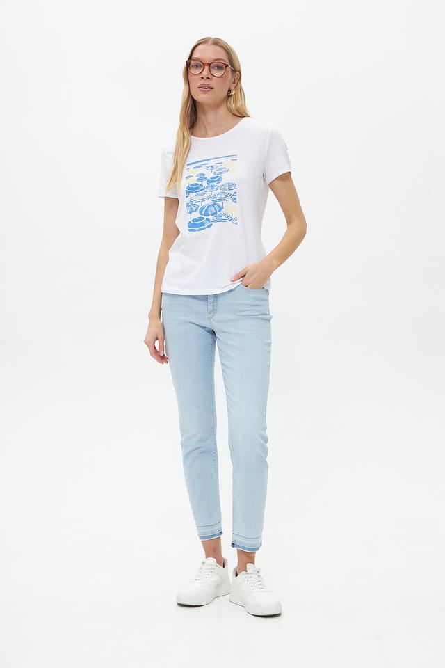 Светло-голубые джинсы Marc Cain с зауженным к низу кроем и небольшим декоративным элементом на заднем кармане. Модель выполнена из качественного хлопка с добавлением эластана для комфортной посадки и свободы движений. Состав: хлопок 92%, эластомультиэстер 6%, эластан 2%