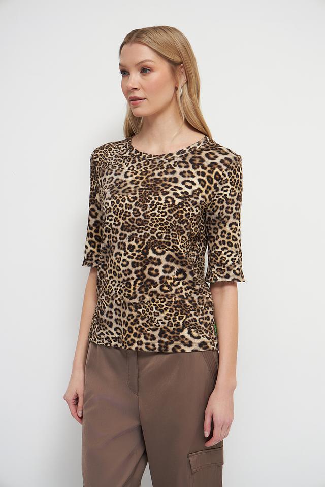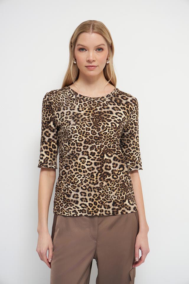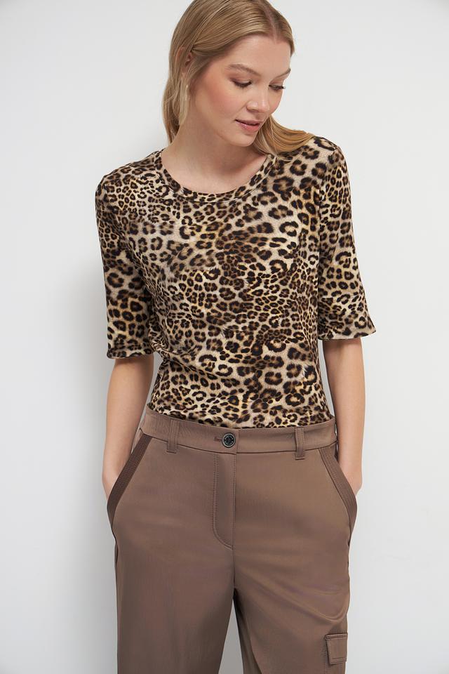 Дизайн футболки выполнен в ярком леопардовом принте, который добавит образу динамичности и индивидуальности. Круглый вырез горловины и короткие рукава делают эту модель универсальной и подходящей для различных случаев.