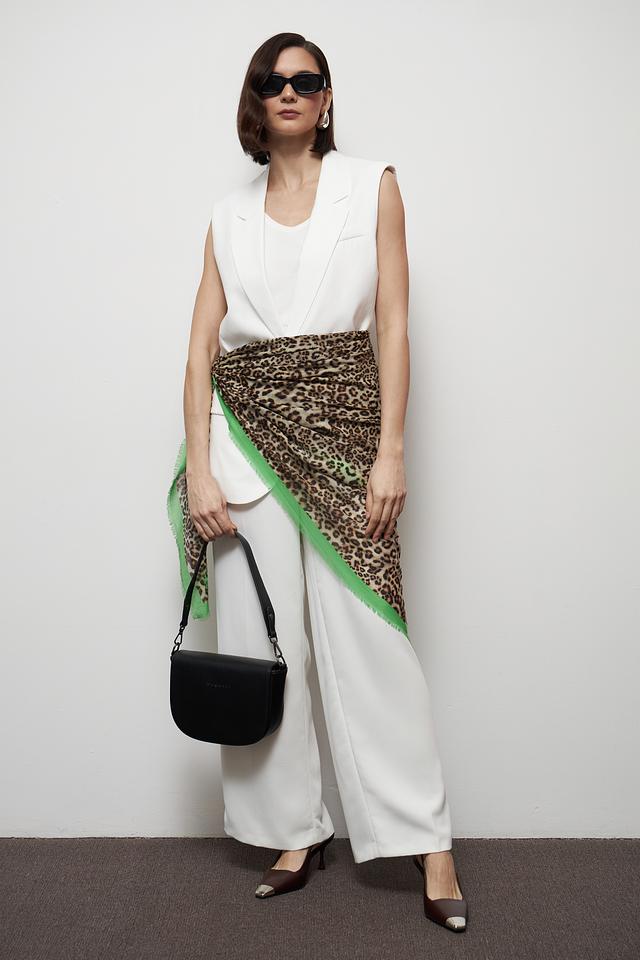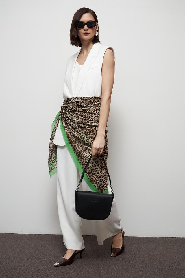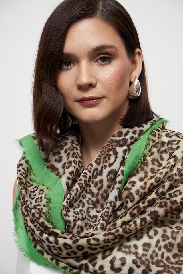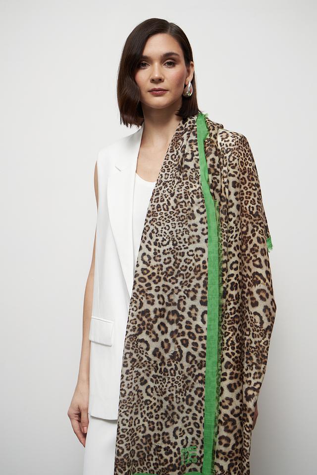 Этот элегантный платок от Marc Cain выполнен в эффектном леопардовом принте, который добавит изюминку в любой наряд. Яркая зелёная отделка по краю контрастирует с основным рисунком, делая аксессуар особенно привлекательным.