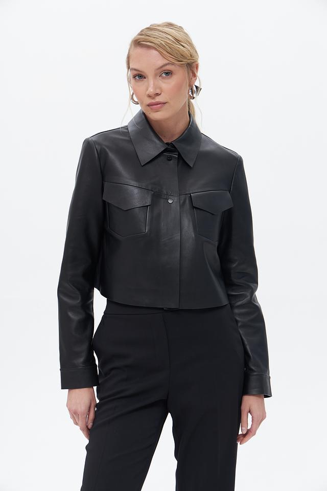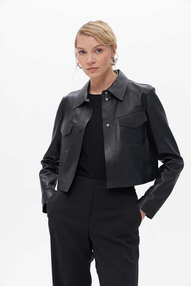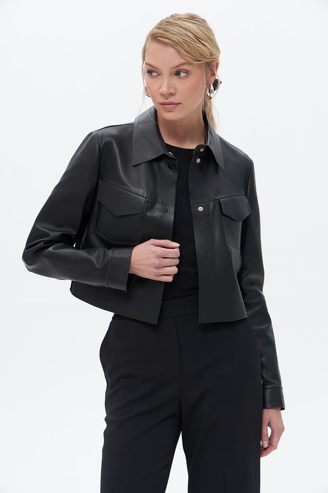 Чёрный кожаный жакет Marc Cain – стильная и современная модель укороченного кроя. Жакет имеет рубашечный силуэт с лацканами и застёжкой на пуговицы, а также накладные карманы на груди. Состав: кожа 100%