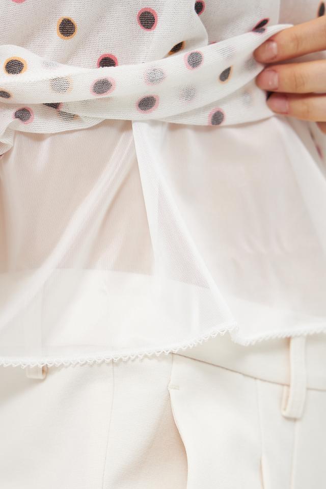 Топ Marc Cain Collections белого цвета с мелким коричневым горошком — стильная и лёгкая модель на каждый день. Изготовлен из полупрозрачной ткани с нежным оборками по горловине. Состав: хлопок 82%, полиамид 18%