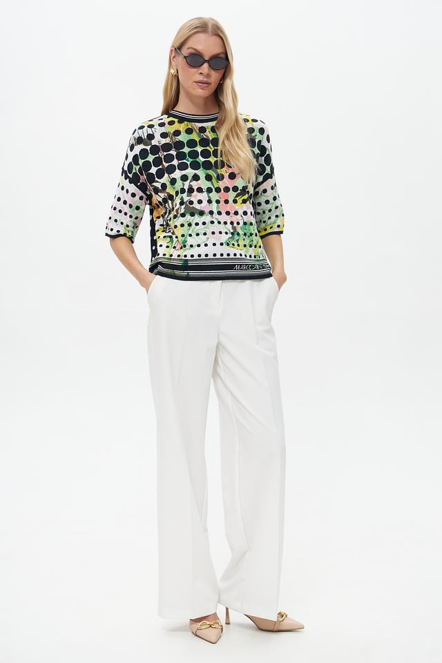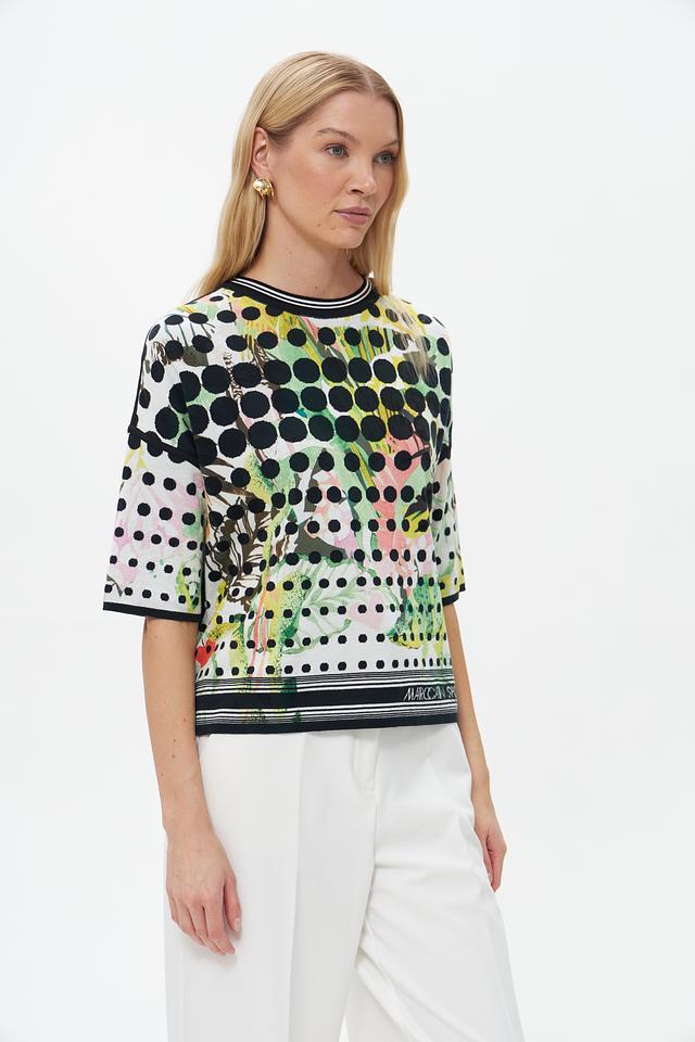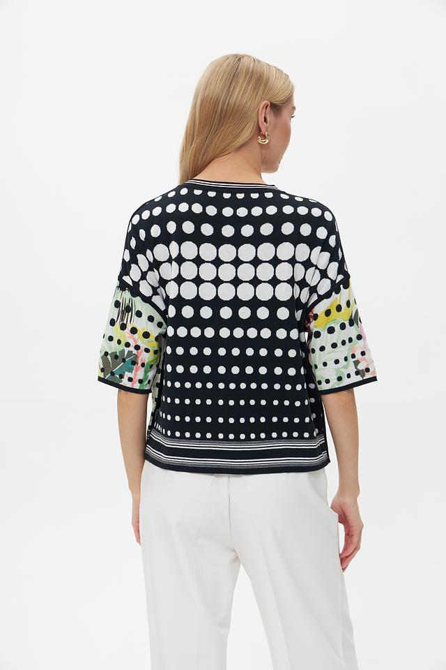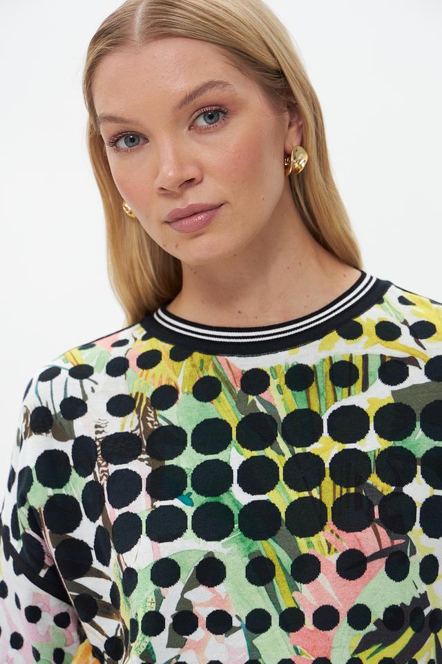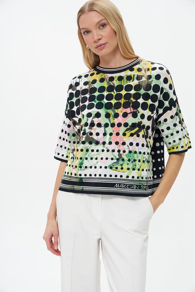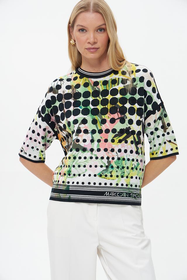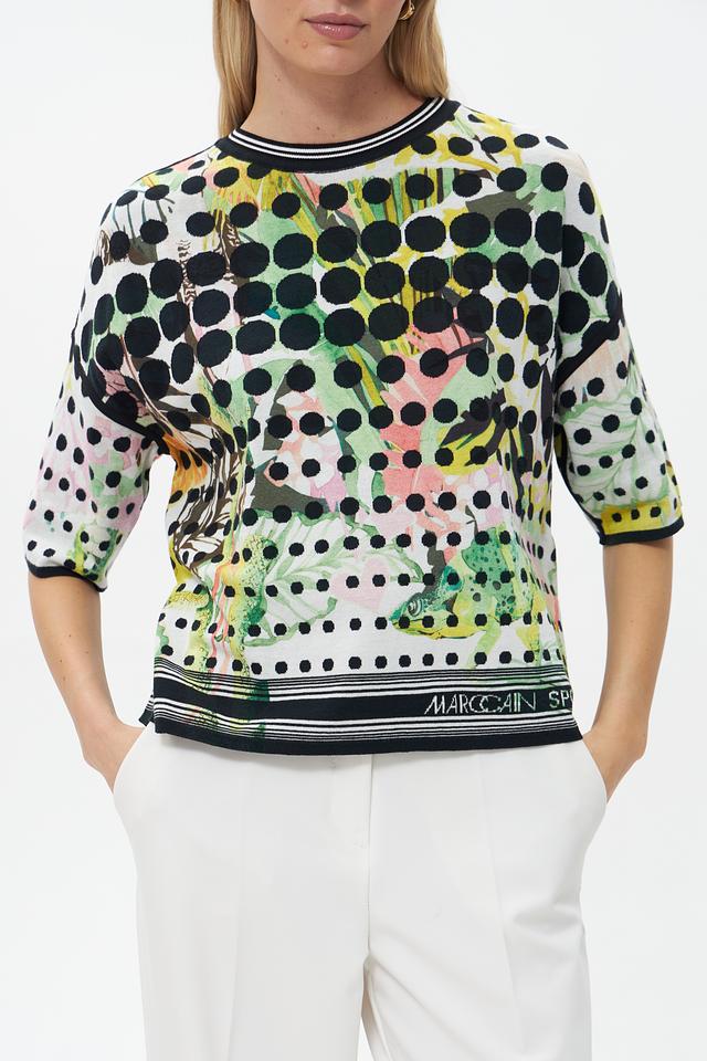 Женский пуловер Marc Cain с ярким цветочным принтом и узором в горошек. Модель выполнена из 100% хлопка, что обеспечивает комфорт и приятные тактильные ощущения. Идеальный выбор для создания стильного и лёгкого образа. Состав: хлопок 100%