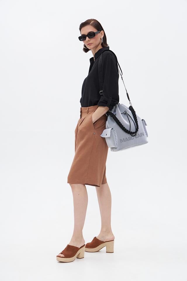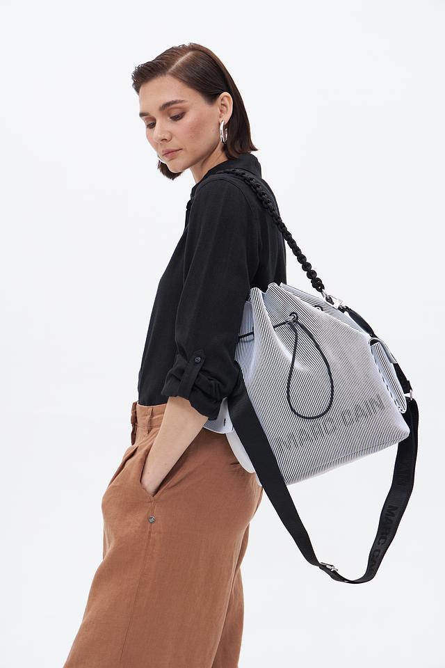 Представляем стильную и практичную сумку от бренда Marc Cain. Модель выполнена в актуальной сине-белой полоску, что делает её универсальным дополнением к вашему образу.