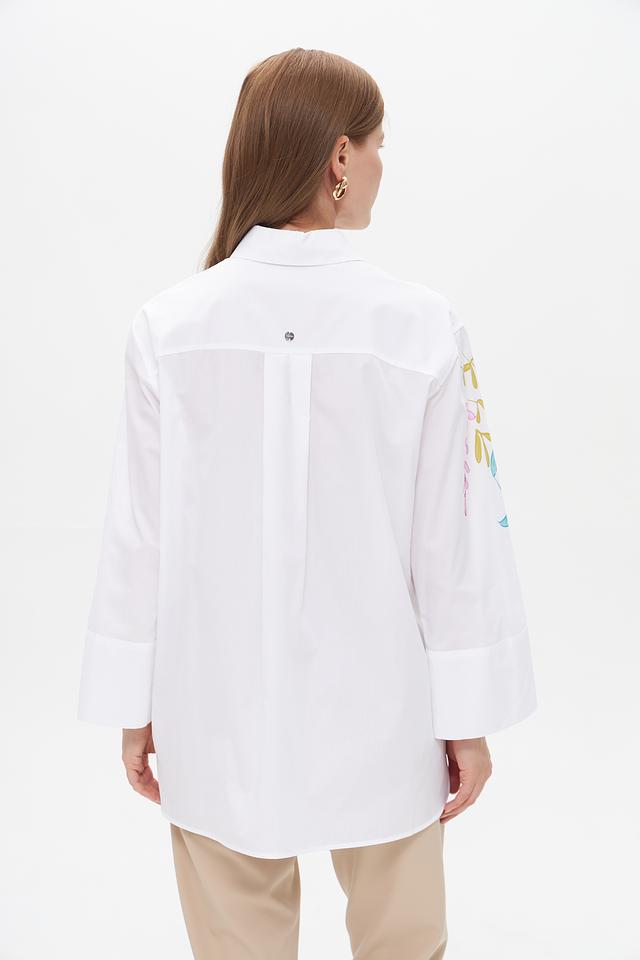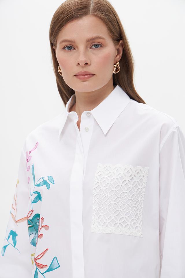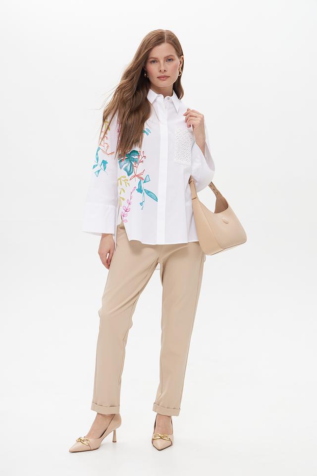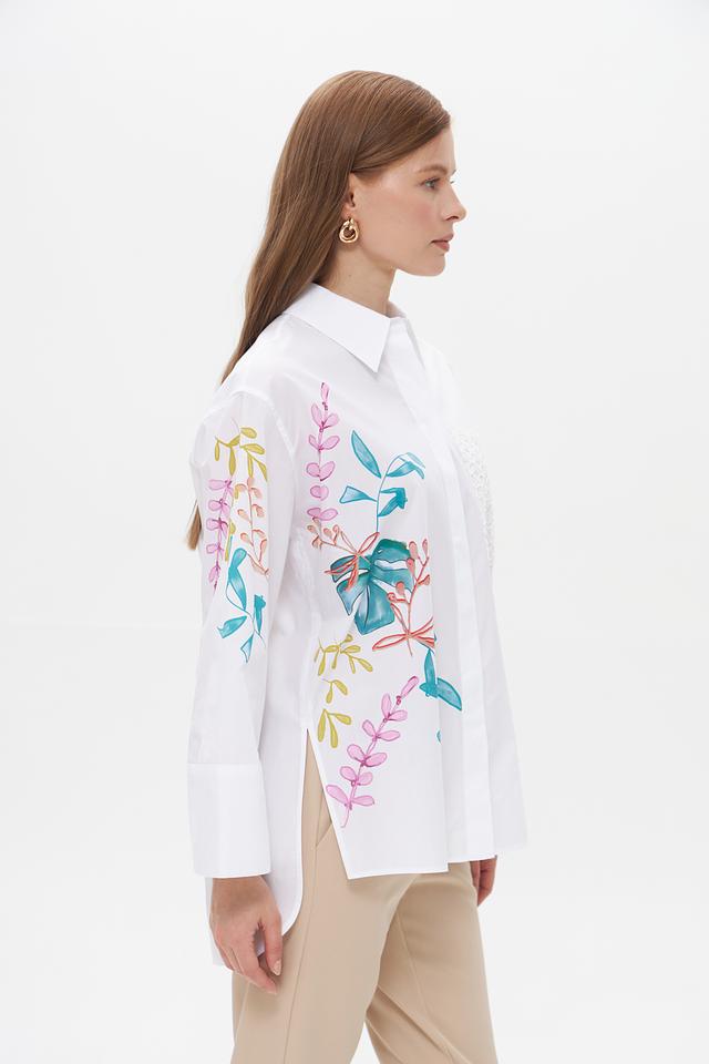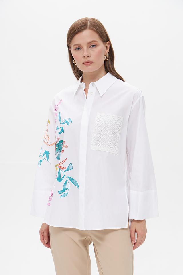 Блуза имеет классический белый цвет, который легко сочетается с различными элементами одежды. Передняя часть и рукава украшены яркой цветочной вышивкой, выполненной в нежных оттенках голубого, розового и зеленого. На груди расположена кружевная вставка, добавляющая образу изысканности.