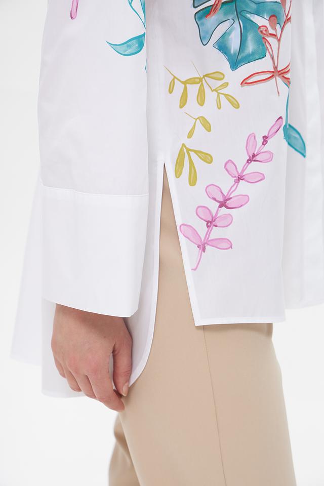 Белая блуза Marc Cain из 100% хлопка, украшенная цветочной вышивкой и кружевной вставкой. Стильная модель с длинным рукавом и воротником классического кроя. Состав: хлопок 100%