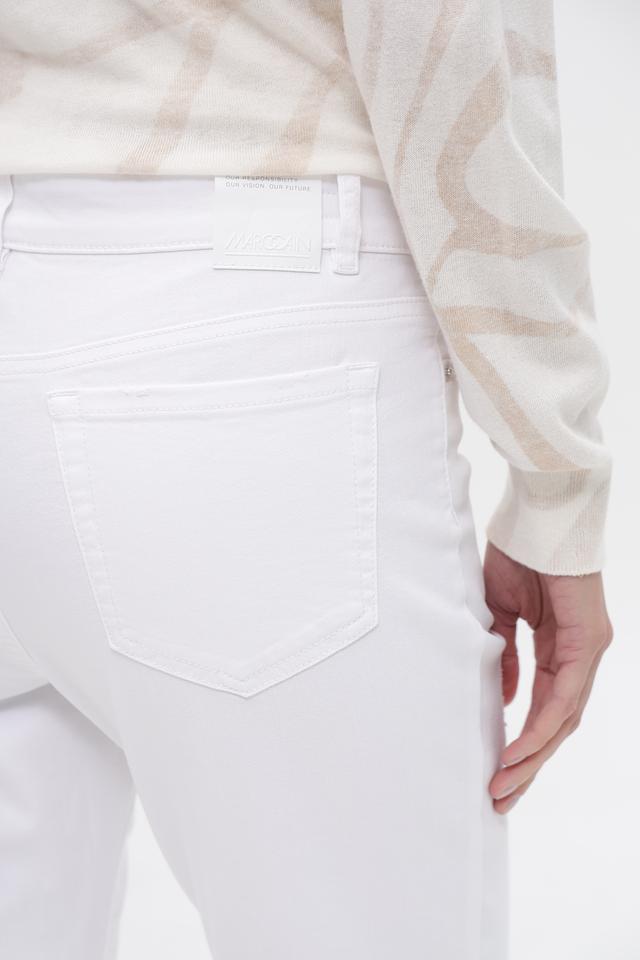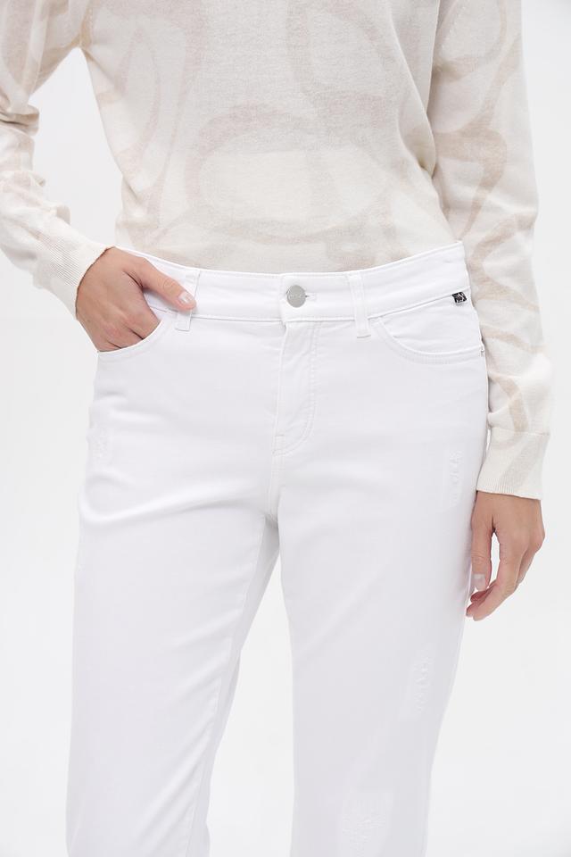 Белые прямые джинсы Marc Cain из переработанного хлопка с эффектом потертости. Модель выполнена из мягкого и комфортного денима с добавлением эластана для оптимальной посадки. Состав: переработ.хлопок 70%, хлопок 20%, эластомультиэстер 8%, эластан 2%