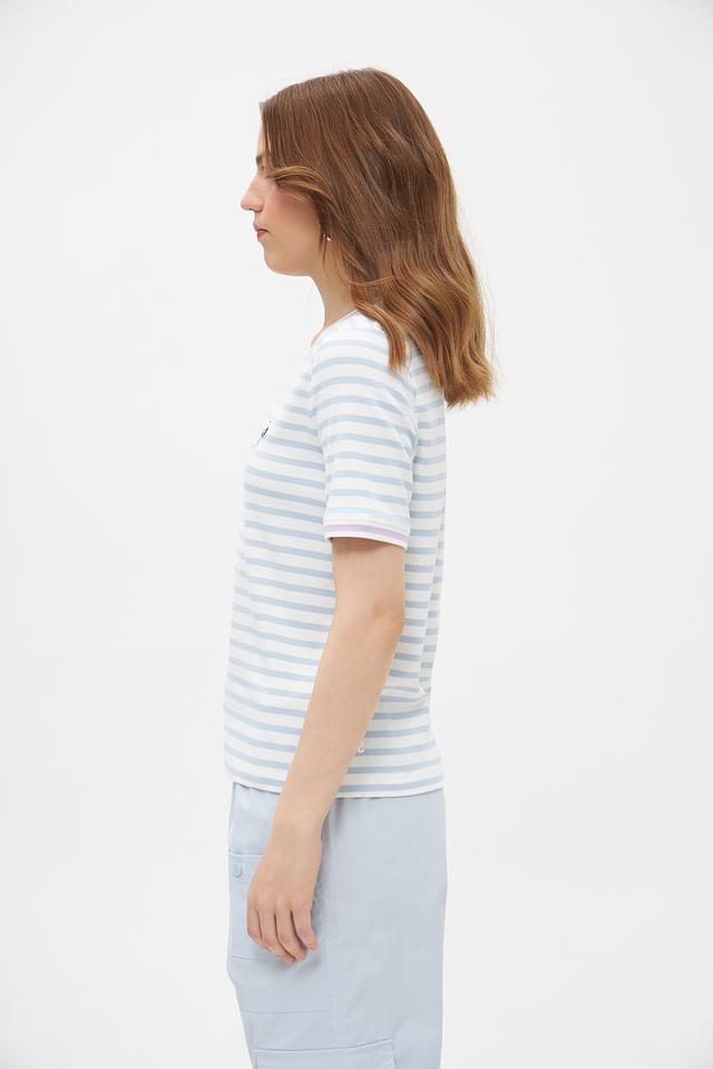 Женская футболка Marc Cain голубого цвета в полоску с коротким рукавом. Модель выполнена из хлопка с добавлением эластана, имеет круглый вырез горловины и небольшую вышивку на груди. Состав: хлопок 94%, эластан 6%