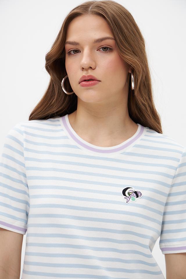 Футболка имеет классический крой с короткими рукавами и круглым вырезом горловины. Голубая полоска придает ей свежий и легкий вид. Небольшая вышивка на груди добавляет изысканности и оригинальности.
