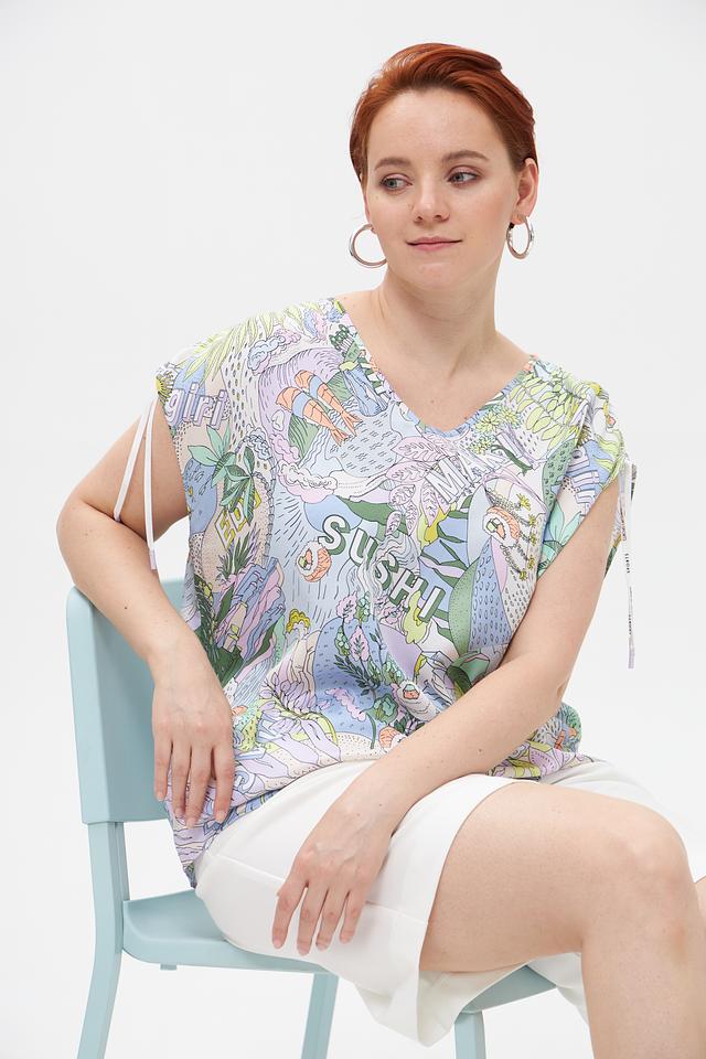 Блузка Marc Cain голубого цвета с оригинальным принтом в виде суши и японских мотивов. Изготовлена из легкой и приятной к телу вискозы, идеально подходит для создания летних образов. Состав: вискоза 100%