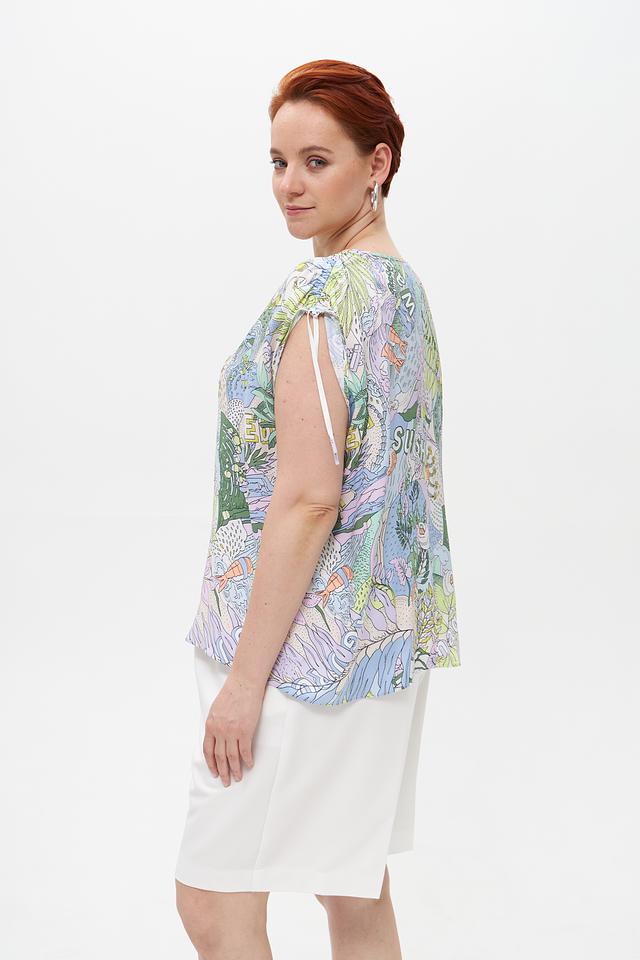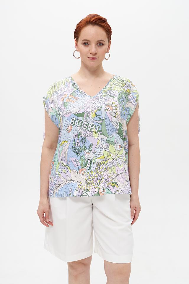 Блузка имеет свободный крой, V-образный вырез и открытые плечи, что придает ей непринужденный и стильный вид. Оригинальный принт с изображением суши, японских мотивов и надписями делает эту модель уникальной и запоминающейся.