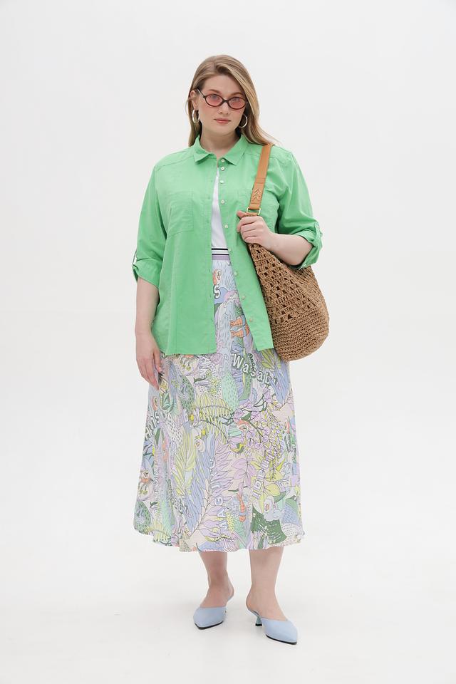 Основным акцентом юбки является яркий и оригинальный принт с изображением растительных мотивов и надписей. Эластичный пояс обеспечивает надежную посадку по фигуре, подчеркивая талию.