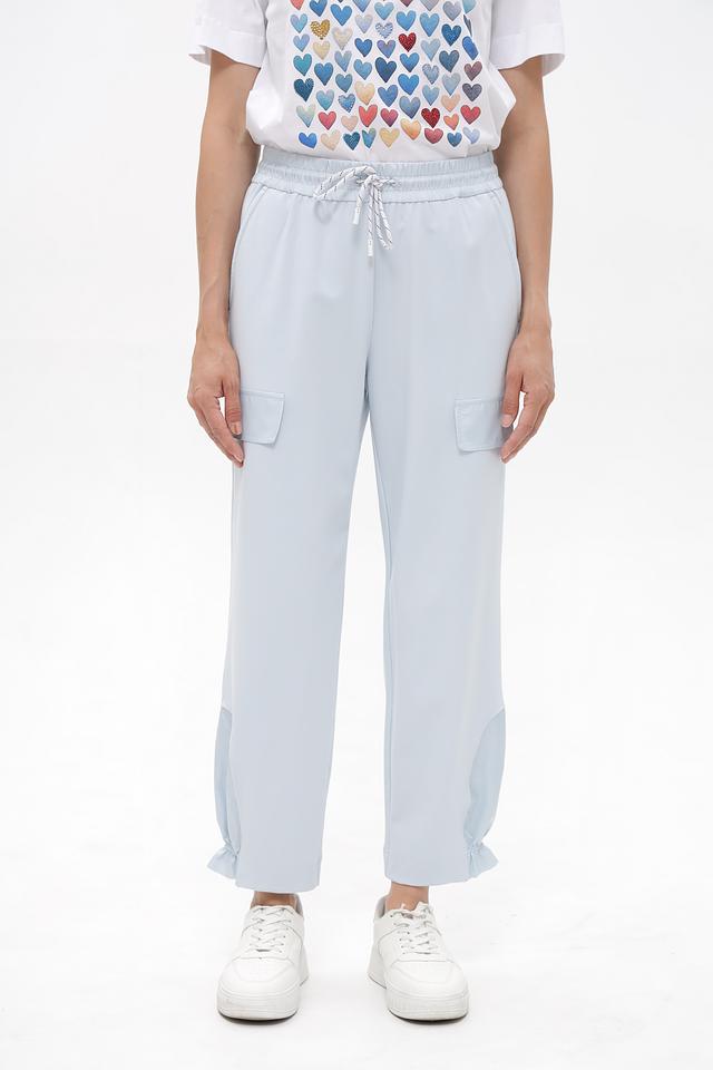 Брюки имеют удобный эластичный пояс с регулируемым шнурком, обеспечивающим комфортную посадку. Функциональные карманы позволяют удобно хранить необходимые мелочи. По низу брюк выполнены небольшие сборки, придающие образу лёгкость и динамичность.