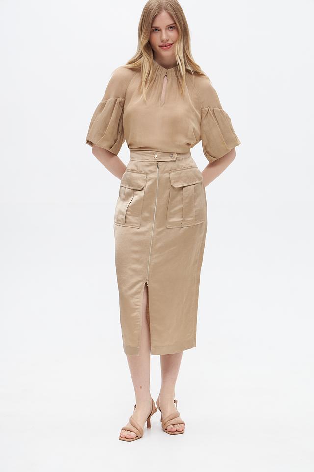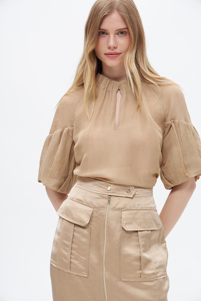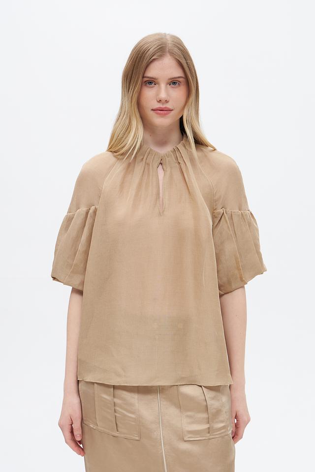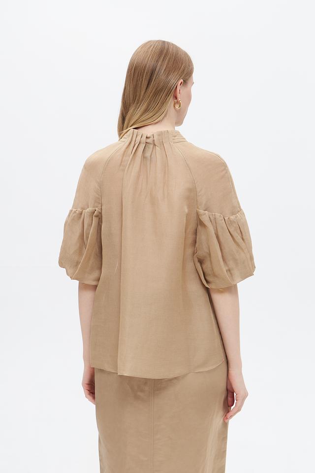 Бежевая блуза Marc Cain из льна и шёлка с рукавами-фонариками и вырезом-капелькой. Изделие выполнено из натуральных материалов, обеспечивающих комфорт и воздухопроницаемость. Состав: лен 55%, шелк 45%