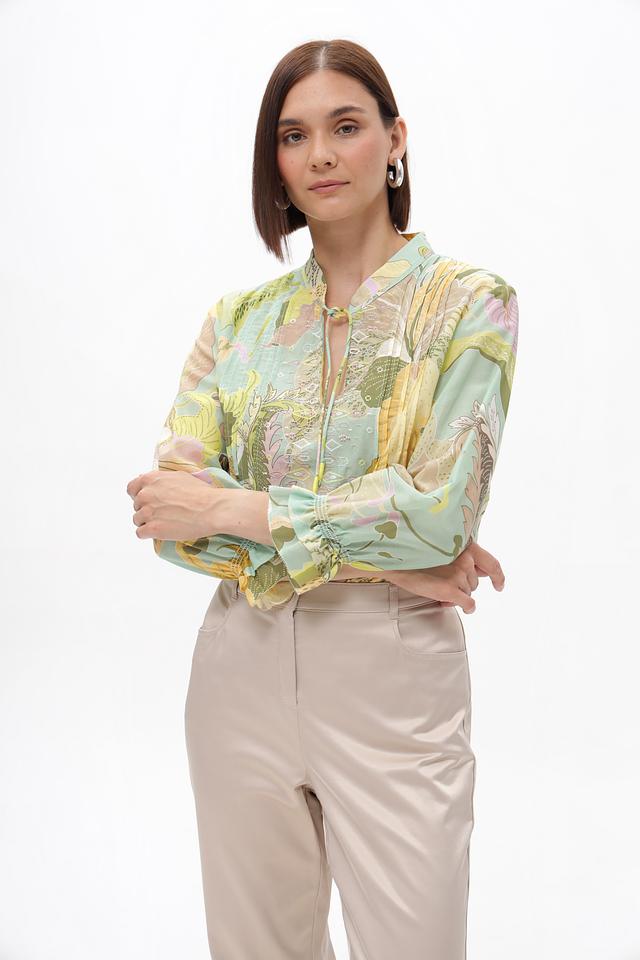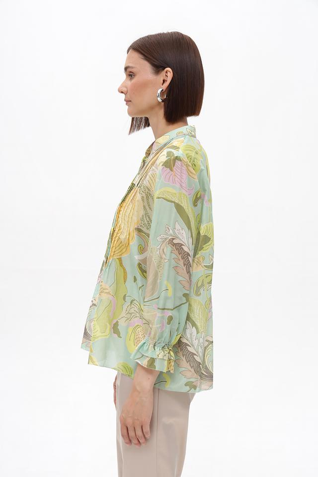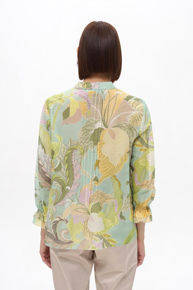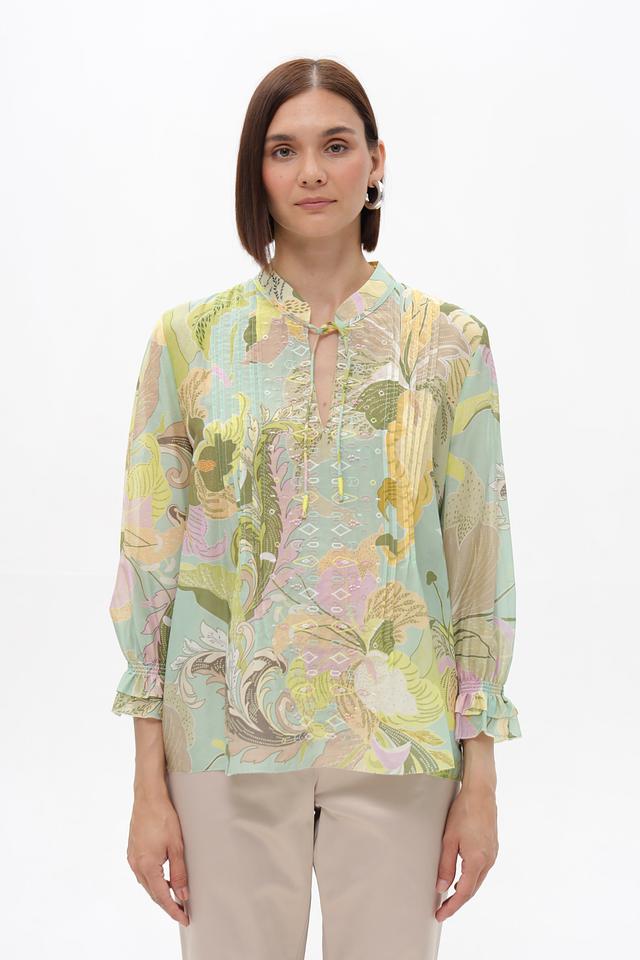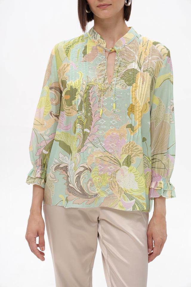 Стильная блузка Marc Cain мятного цвета с ярким цветочным принтом. Изготовлена из лёгкой ткани на основе хлопка и шёлка, обеспечивающей комфорт и воздухопроницаемость. Состав: хлопок 72%, шелк 28%