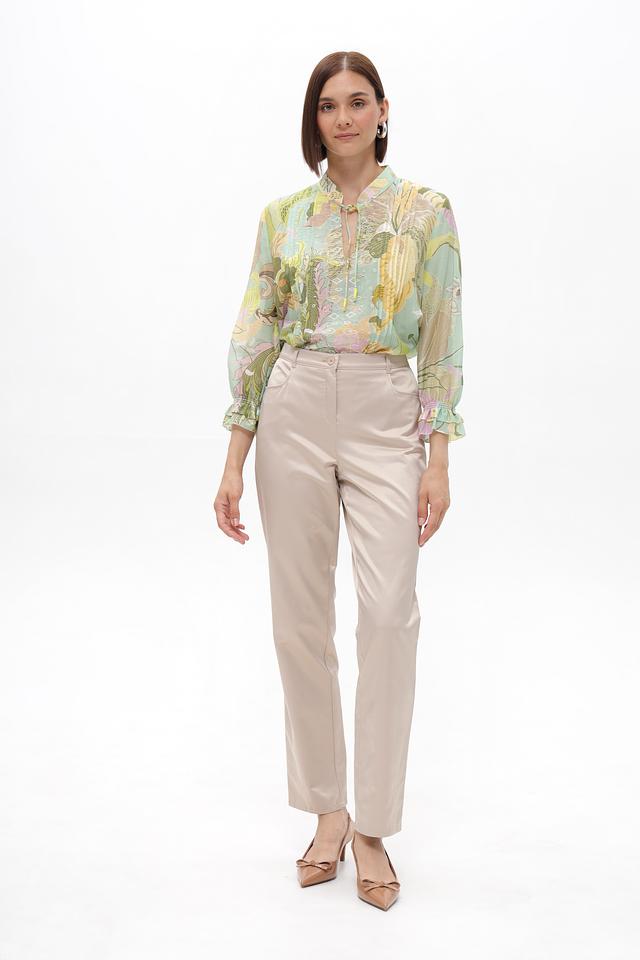 Блузка имеет свободный крой, не сковывающий движений, и рукава длиной 3/4 с аккуратными манжетами. Воротник-стойка с небольшой V-образной горловиной и застежкой на одну пуговицу добавляют образу элегантности.