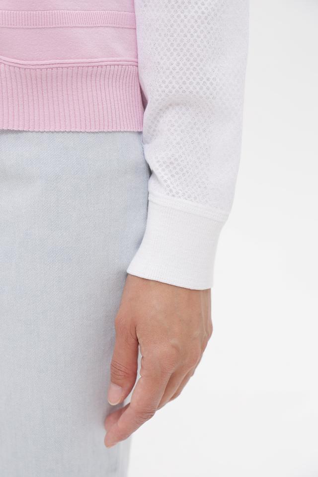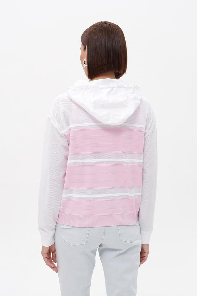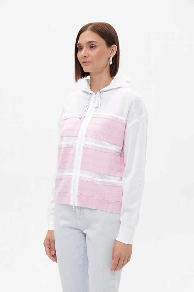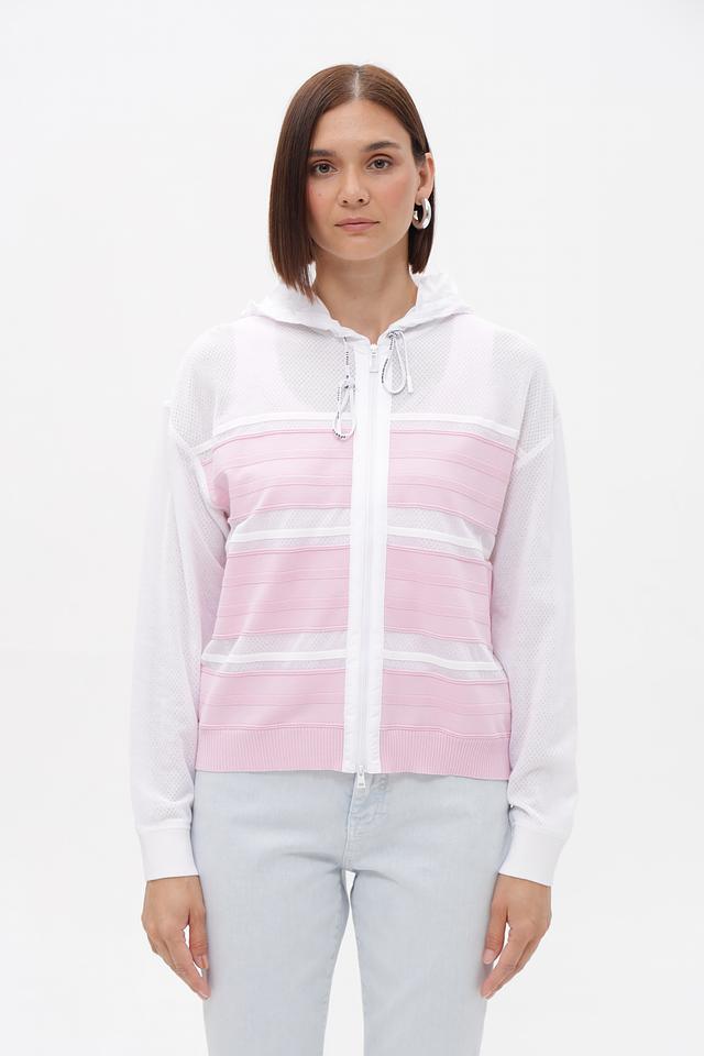 Женский жакет от бренда Marc Cain выполнен в нежном розовом цвете с контрастными белыми полосами. Модель имеет застежку на молнию и удобный капюшон со шнурками.