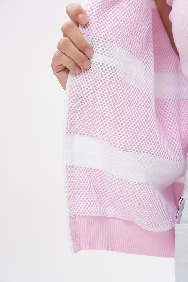 Жакет сочетает в себе элементы спортивного и повседневного стиля. Рукава и часть спинки выполнены из сетчатой ткани, что обеспечивает дополнительную вентиляцию. Манжеты и нижний край изделия обработаны эластичными резинками, обеспечивающими плотное прилегание.