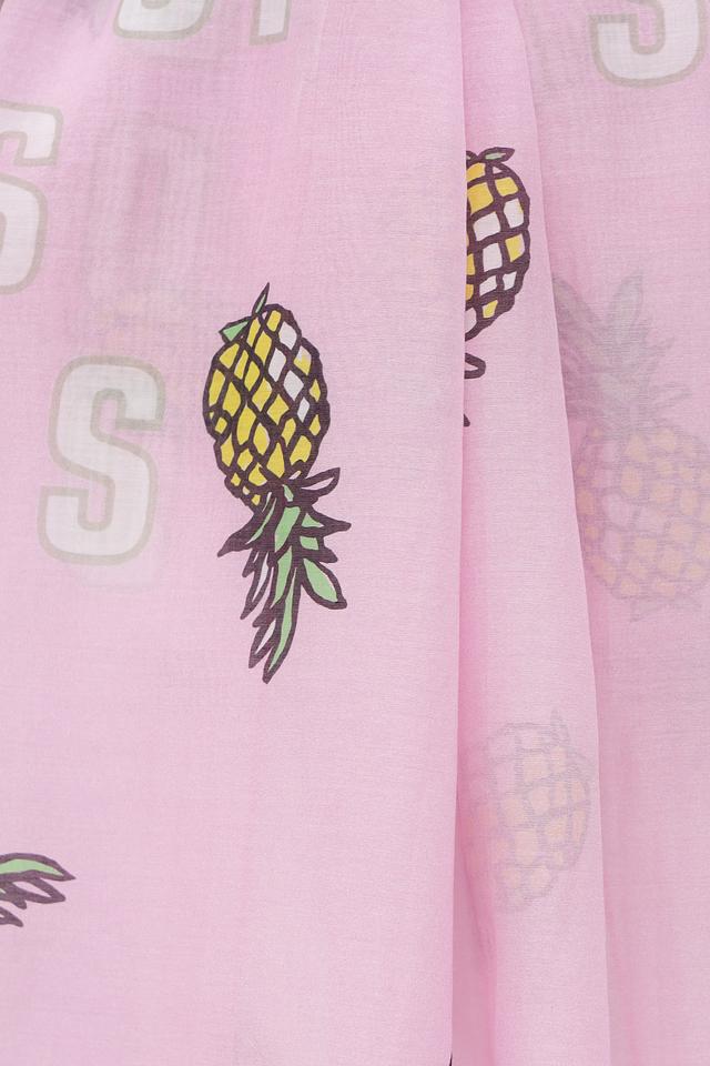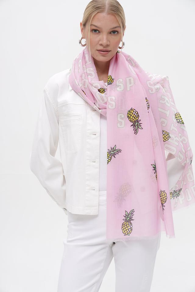 Этот шарф от Marc Cain – прекрасное дополнение к вашему гардеробу. Выполнен в нежном розовом цвете и украшен оригинальным принтом с изображением ананасов и буквенными элементами.