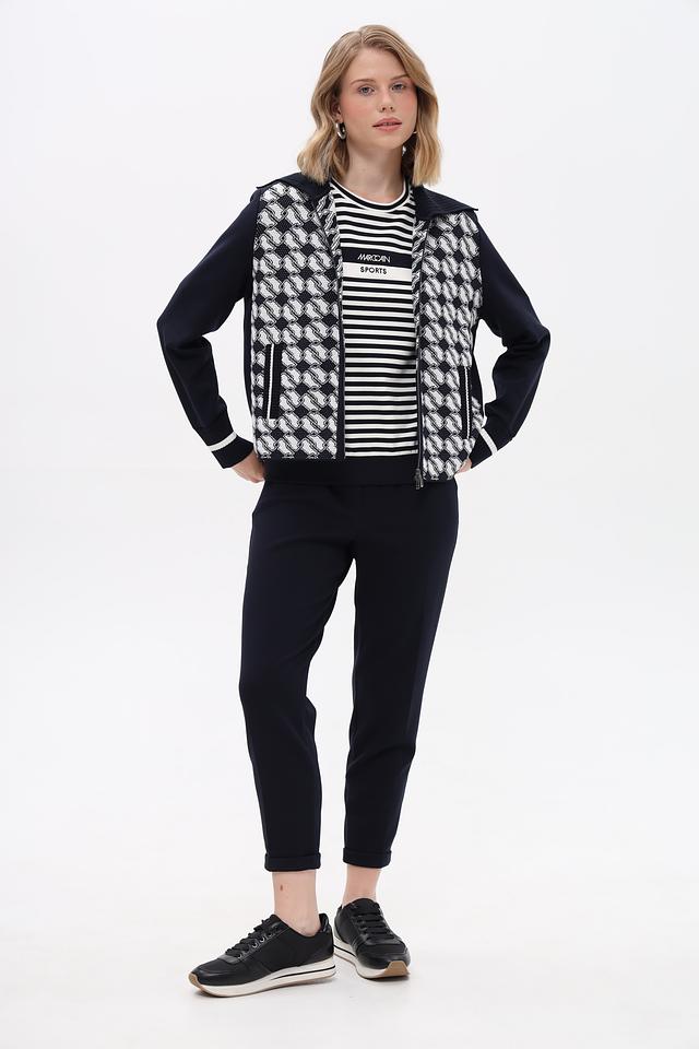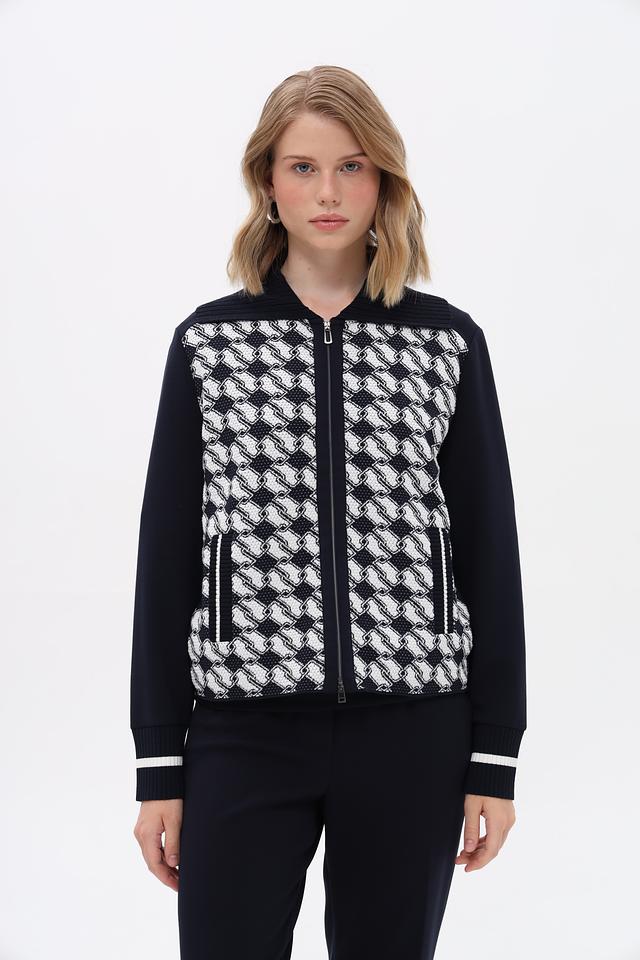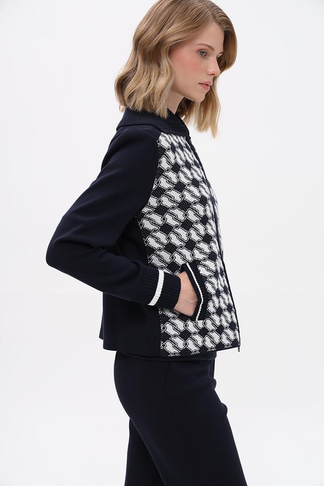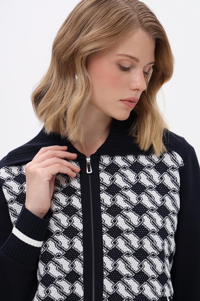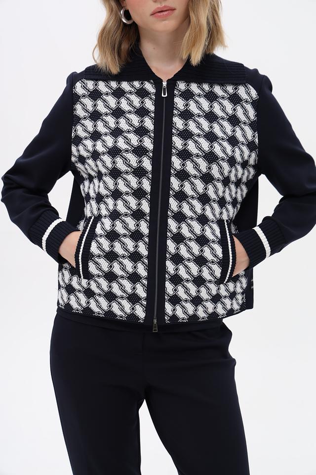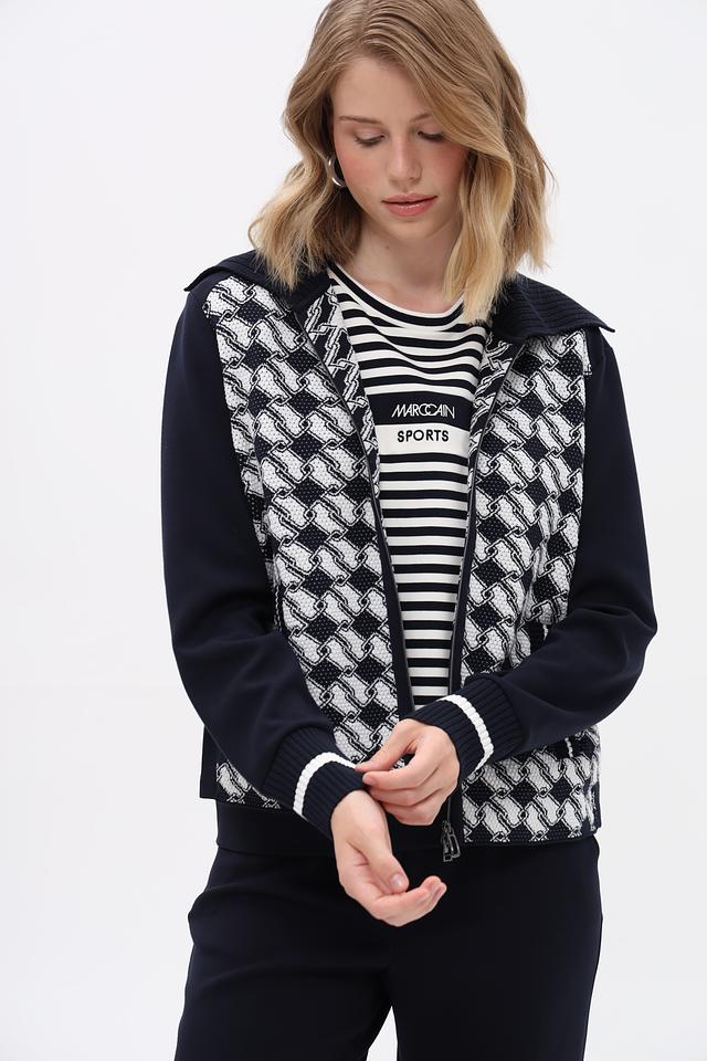 Представляем вашему вниманию элегантный жакет от бренда Marc Cain Sports. Модель выполнена в сочетании синего и белого цветов с графичным принтом, который придает ей особый шарм.