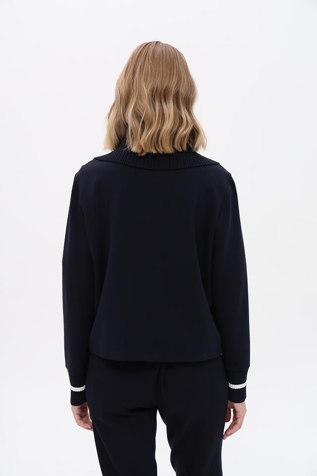 Жакет имеет удобную застежку на молнию, воротник-стойку и длинные рукава, декорированные контрастными манжетами. Крой жакета обеспечивает комфортную посадку по фигуре.
